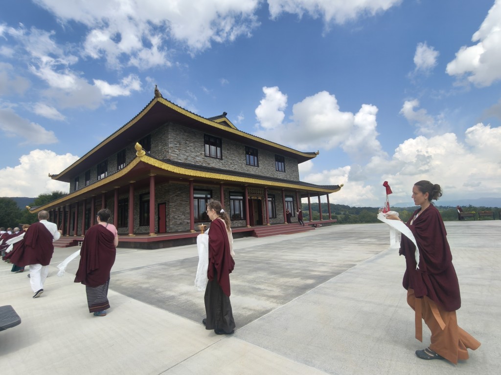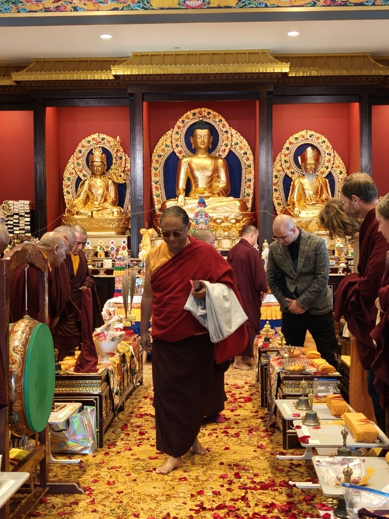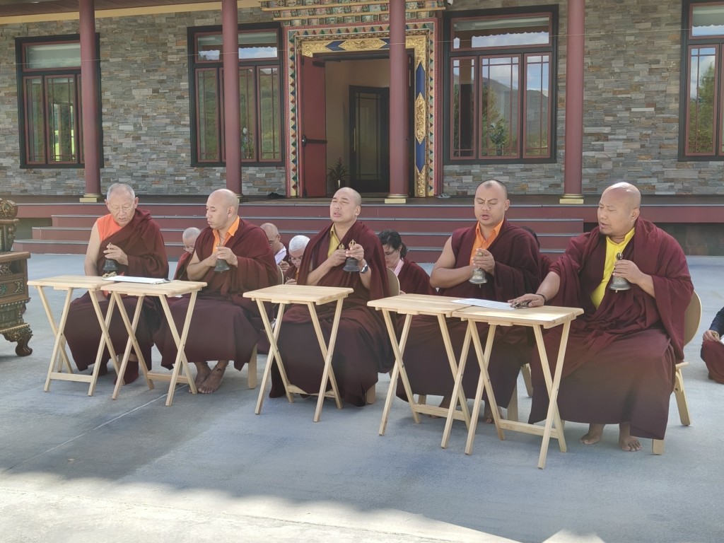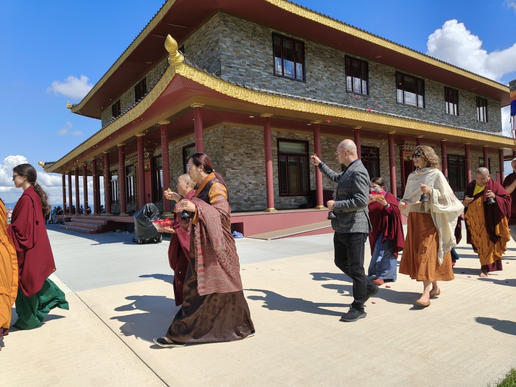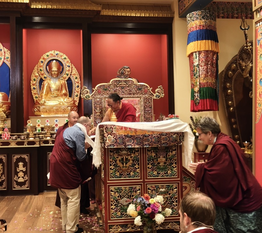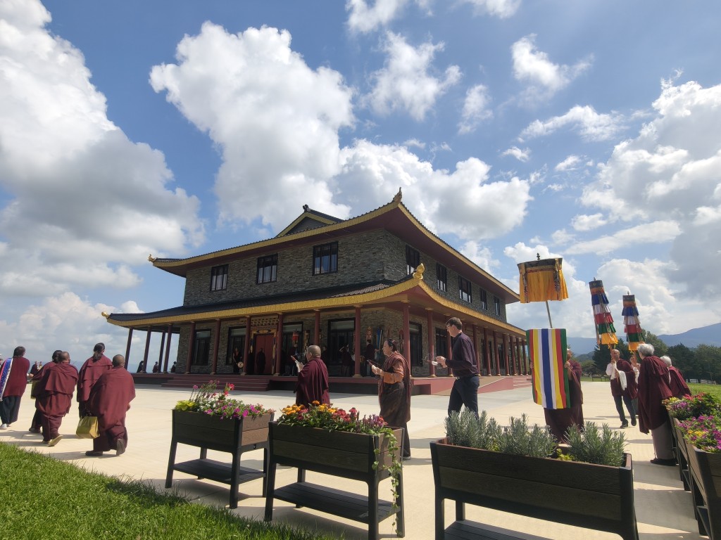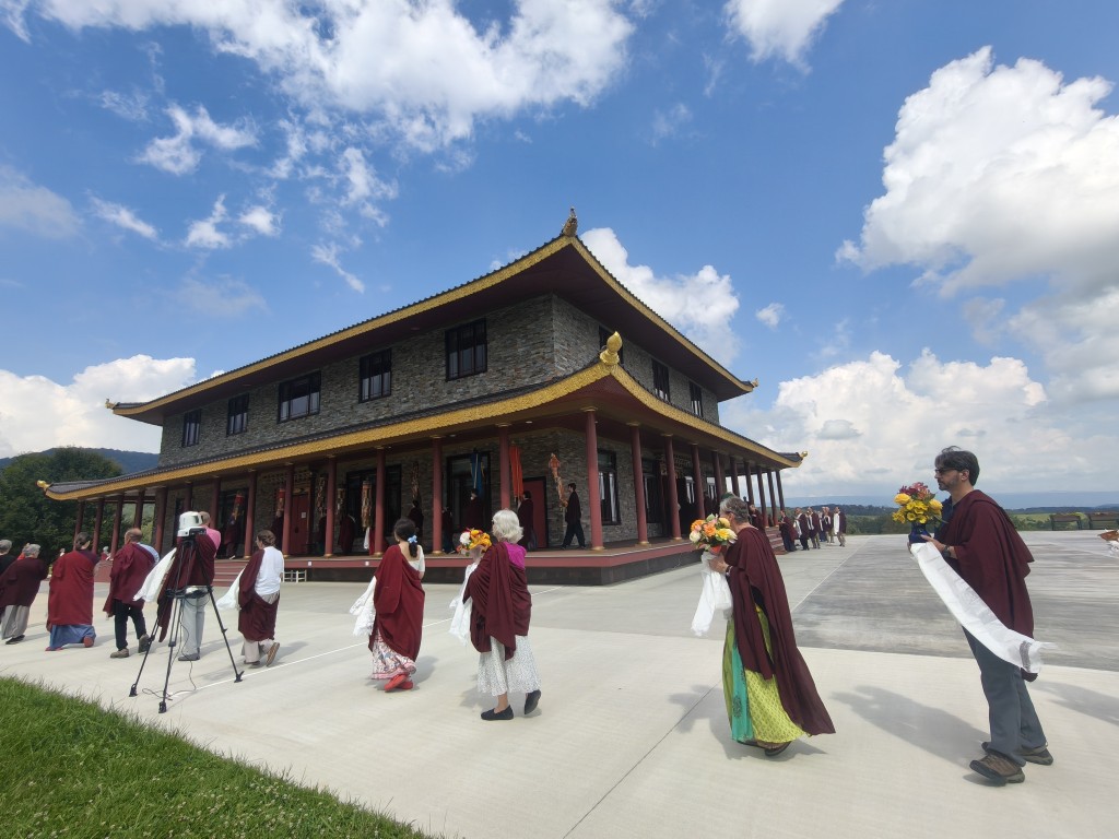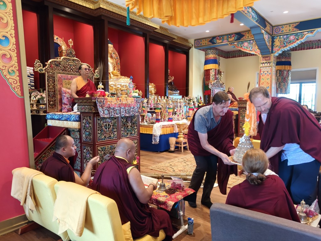 In the summer of 2025 at Mindrolling Lotus Garden, the long-awaited consecration of the newly built temple, Mindrol Gatsal, took place. Mindrolling Lotus Garden sangha members gathered from around the world to take part in this wonderful occasion. The process began with the elaborate po chog, the ritual for transferring the sacred contents, blessings, and siddhis from the old shrine room to the new temple. The po chog was held on the 16th of August, 2025. The ritual centers around the melong, or mirror, that serves as the physical support to gather the jnanasattvas and their blessings that the old shrine room has been imbued with over years of practice, studies, teachings, and transmissions. The melong is then covered in cloth in the colors of the Five Buddha Families and brought in a ceremonial procession from the old temple into the new temple.