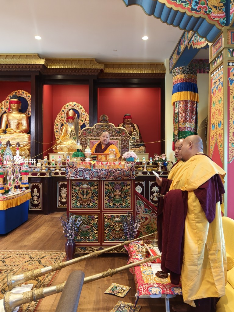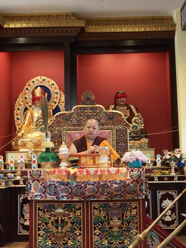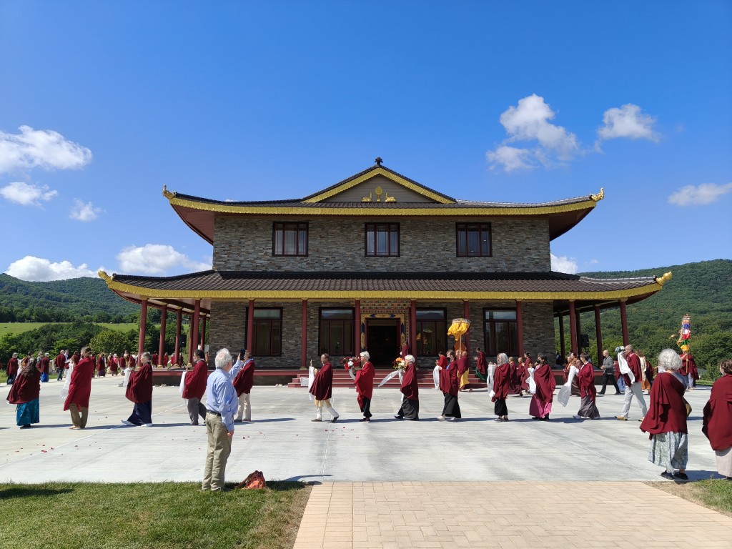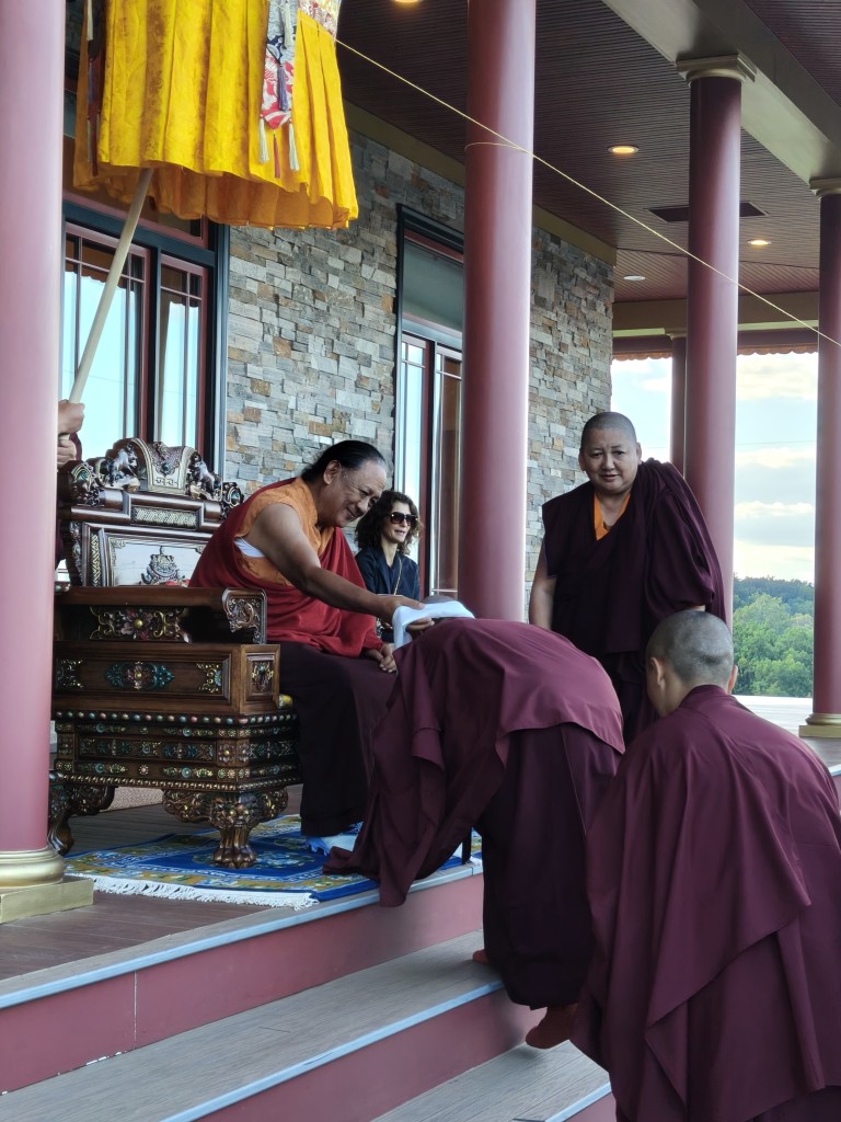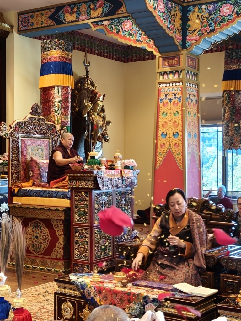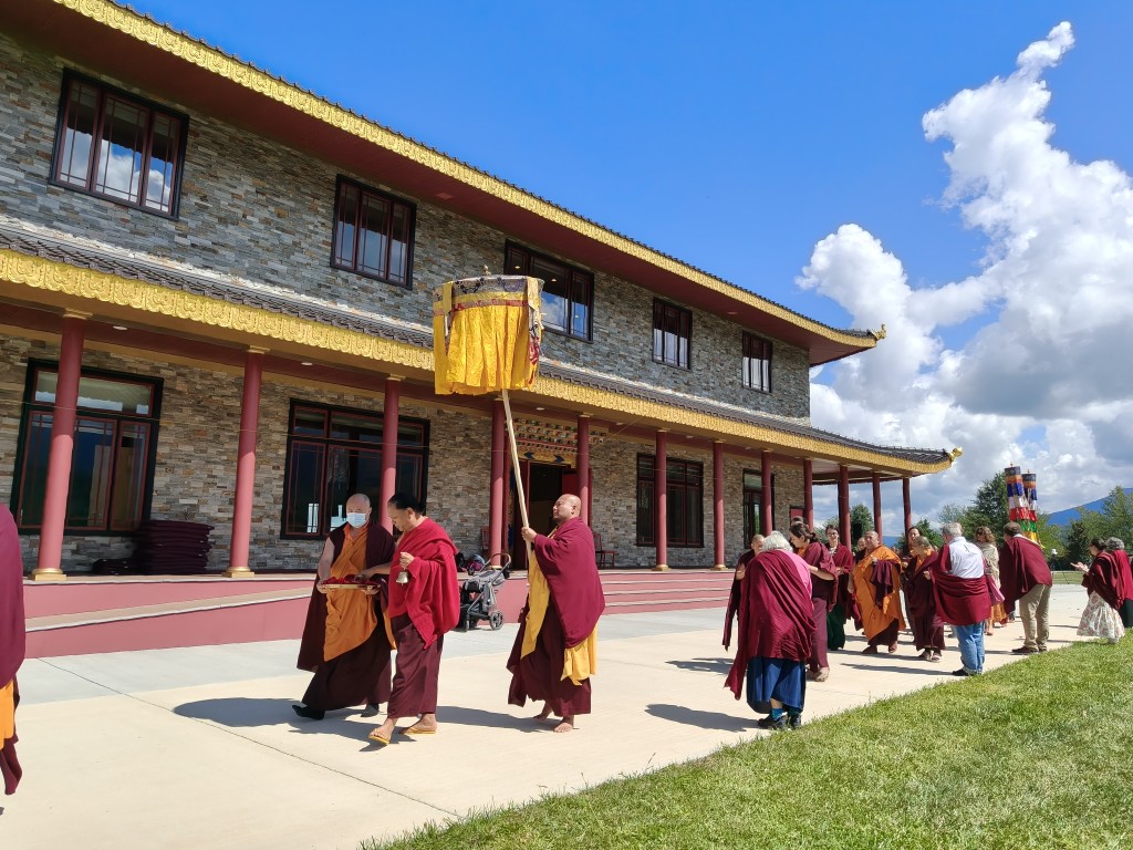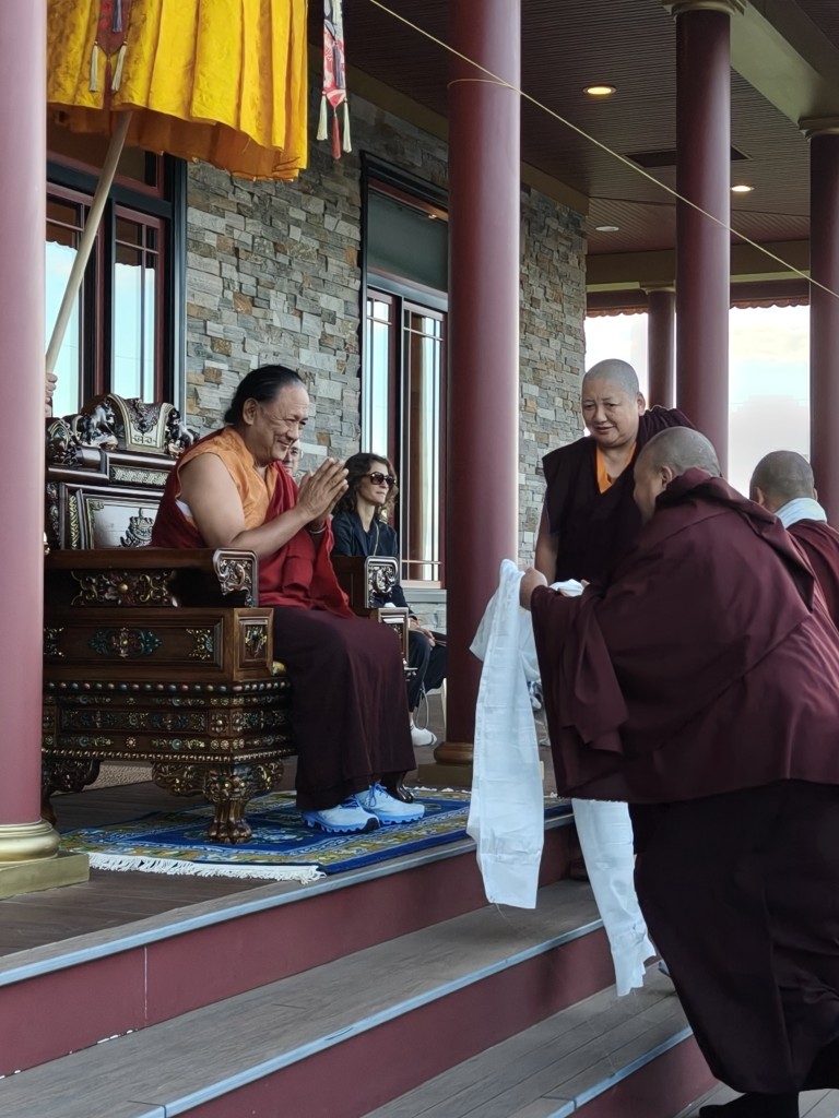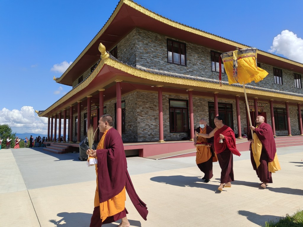 In the summer of 2025 at Mindrolling Lotus Garden, the long-awaited consecration of the newly built temple, Mindrol Gatsal, took place. Mindrolling Lotus Garden sangha members gathered from around the world to take part in this wonderful occasion. The process began with the elaborate po chog, the ritual for transferring the sacred contents, blessings, and siddhis from the old shrine room to the new temple. The po chog was held on the 16th of August, 2025. The ritual centers around the melong, or mirror, that serves as the physical support to gather the jnanasattvas and their blessings that the old shrine room has been imbued with over years of practice, studies, teachings, and transmissions. The melong is then covered in cloth in the colors of the Five Buddha Families and brought in a ceremonial procession from the old temple into the new temple.
