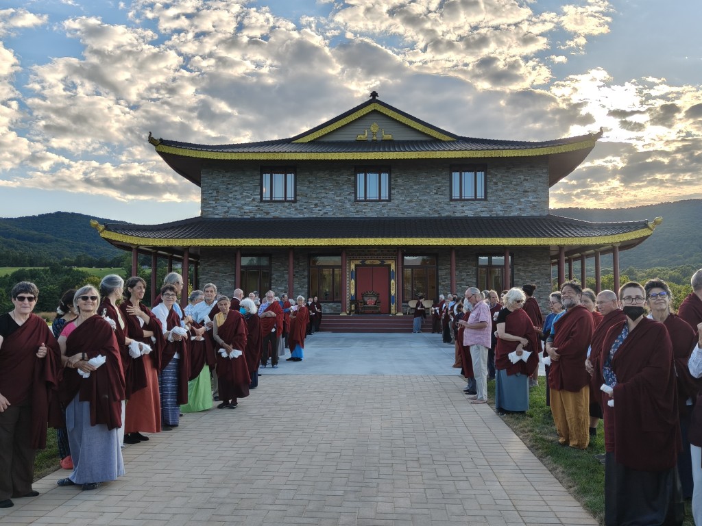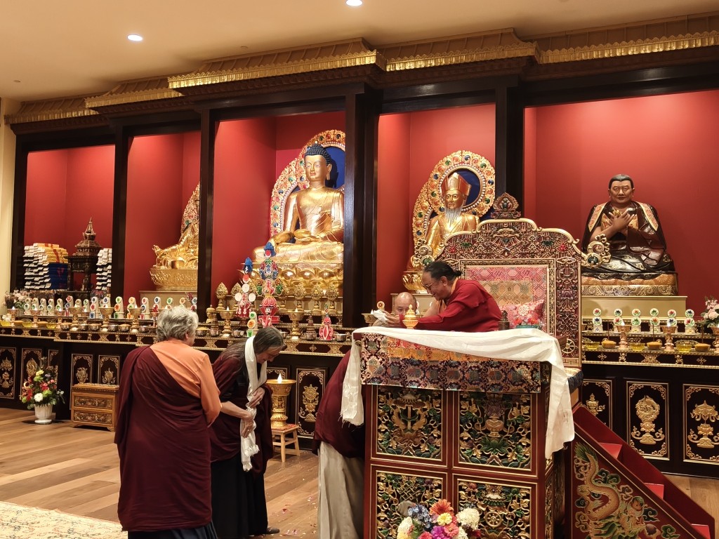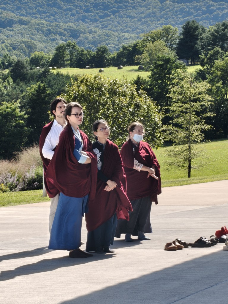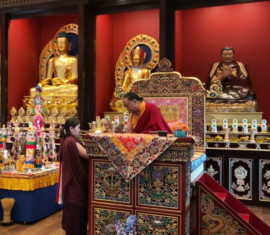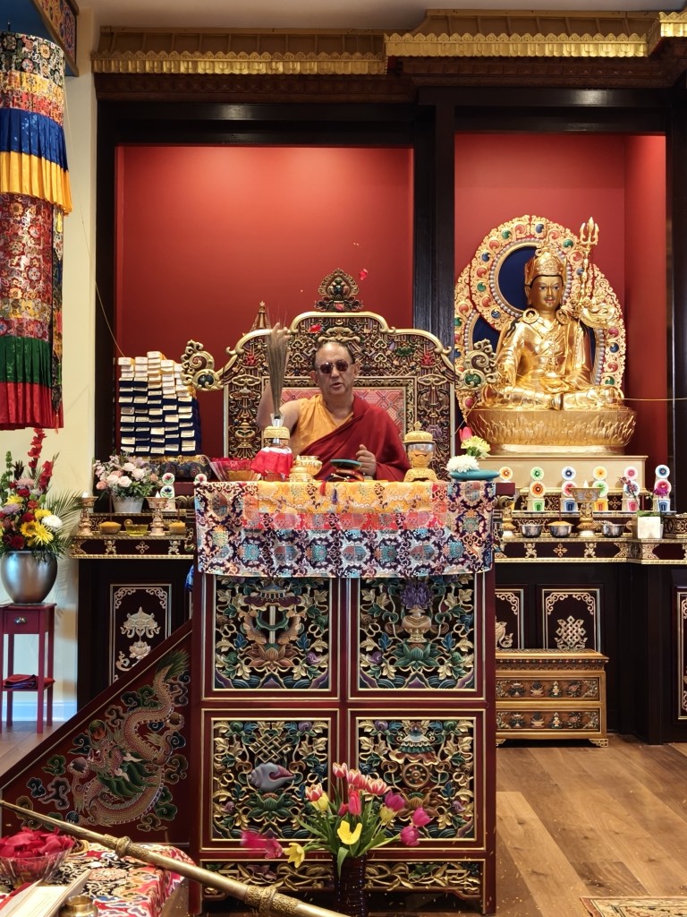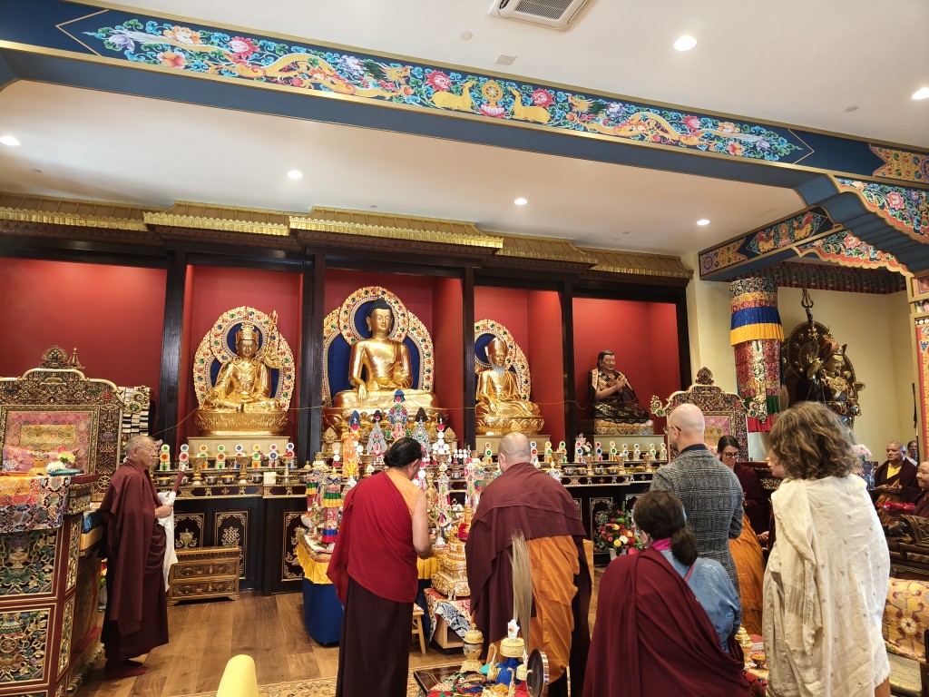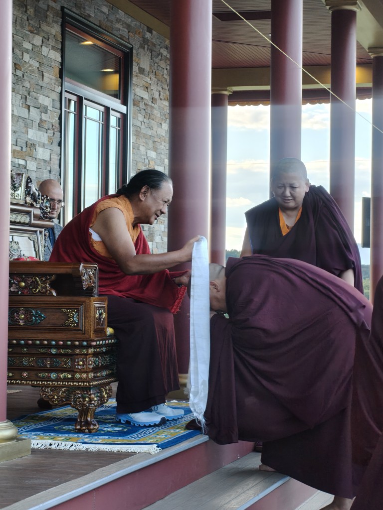 In the summer of 2025 at Mindrolling Lotus Garden, the long-awaited consecration of the newly built temple, Mindrol Gatsal, took place. Mindrolling Lotus Garden sangha members gathered from around the world to take part in this wonderful occasion. The process began with the elaborate po chog, the ritual for transferring the sacred contents, blessings, and siddhis from the old shrine room to the new temple. The po chog was held on the 16th of August, 2025. The ritual centers around the melong, or mirror, that serves as the physical support to gather the jnanasattvas and their blessings that the old shrine room has been imbued with over years of practice, studies, teachings, and transmissions. The melong is then covered in cloth in the colors of the Five Buddha Families and brought in a ceremonial procession from the old temple into the new temple.