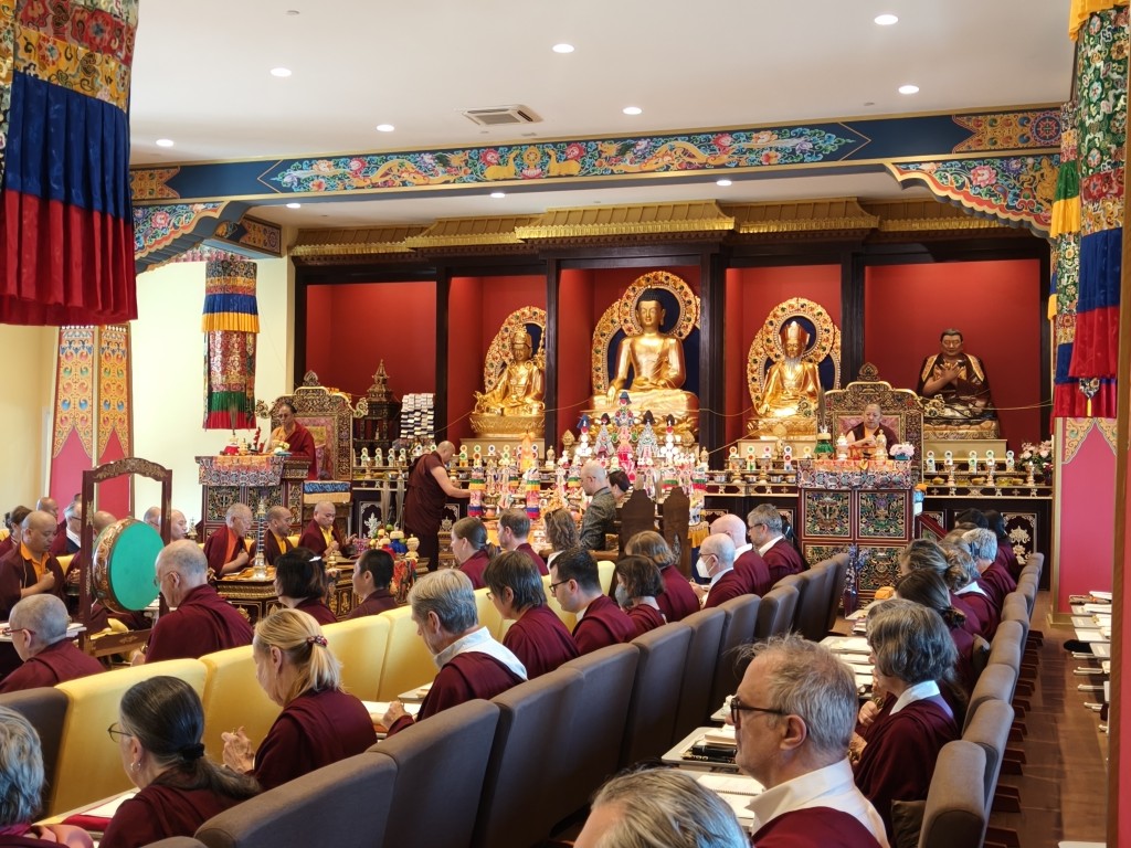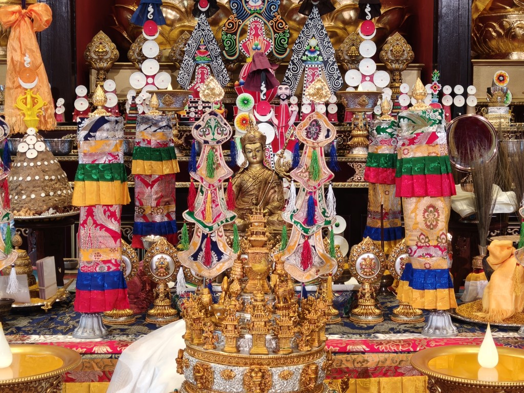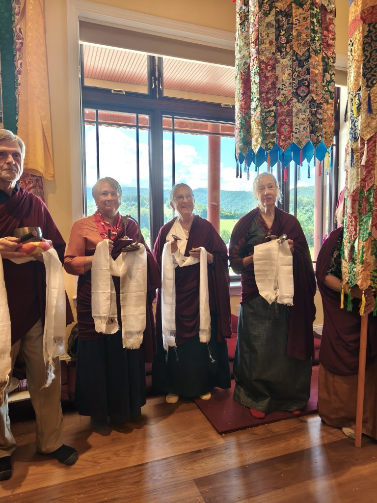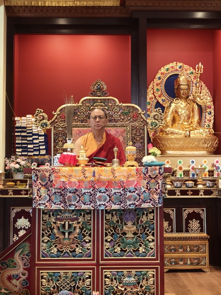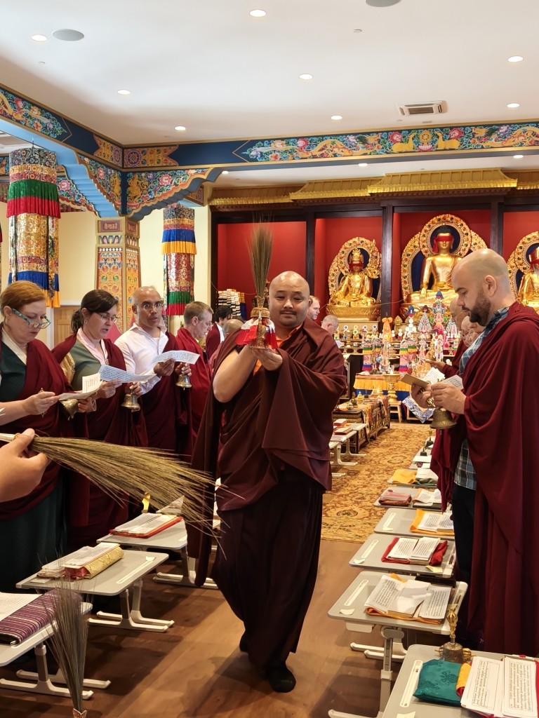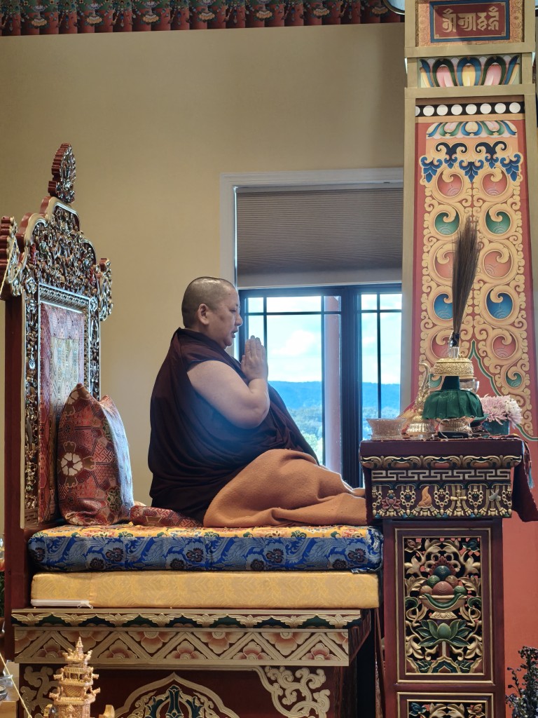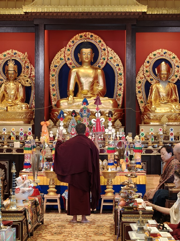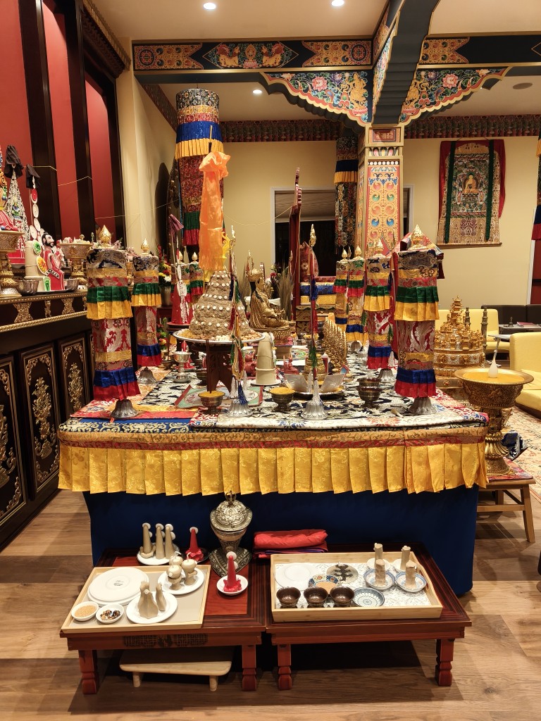 In the summer of 2025 at Mindrolling Lotus Garden, the long-awaited consecration of the newly built temple, Mindrol Gatsal, took place. Mindrolling Lotus Garden sangha members gathered from around the world to take part in this wonderful occasion. The process began with the elaborate po chog, the ritual for transferring the sacred contents, blessings, and siddhis from the old shrine room to the new temple. The po chog was held on the 16th of August, 2025. The ritual centers around the melong, or mirror, that serves as the physical support to gather the jnanasattvas and their blessings that the old shrine room has been imbued with over years of practice, studies, teachings, and transmissions. The melong is then covered in cloth in the colors of the Five Buddha Families and brought in a ceremonial procession from the old temple into the new temple.