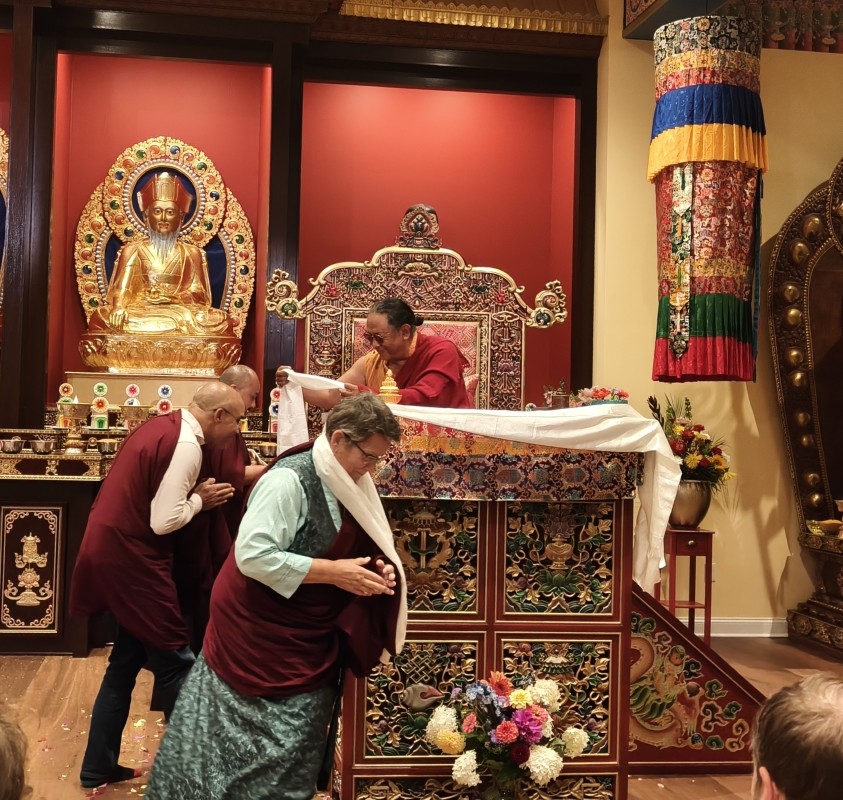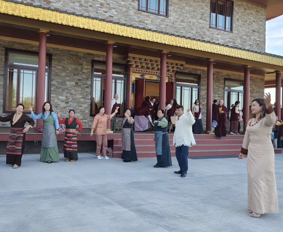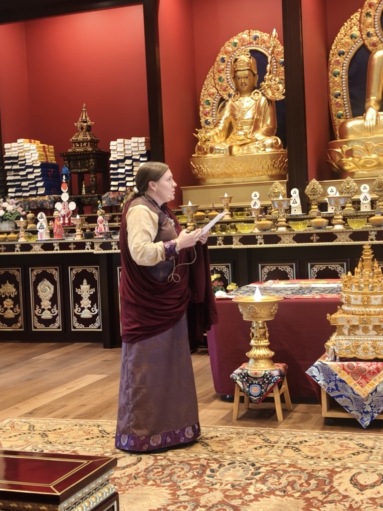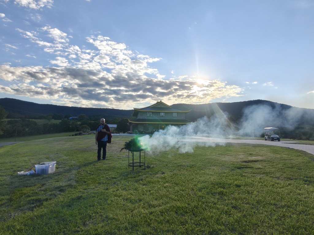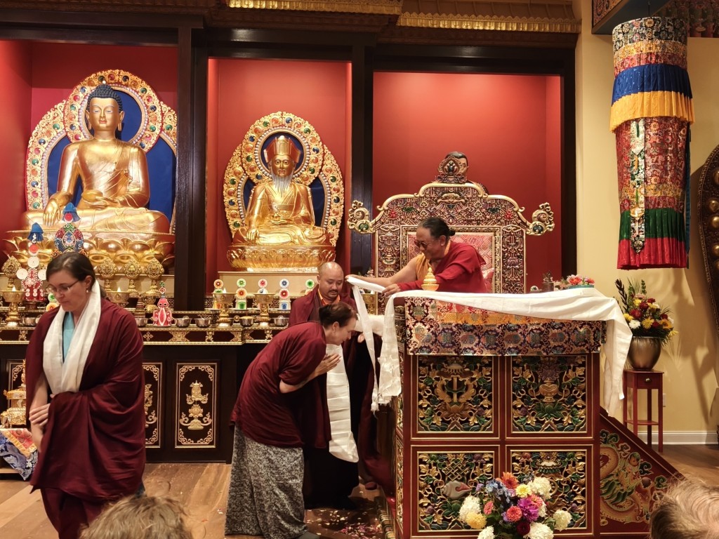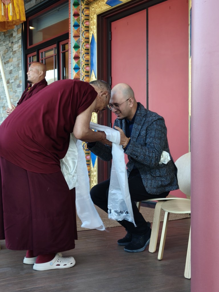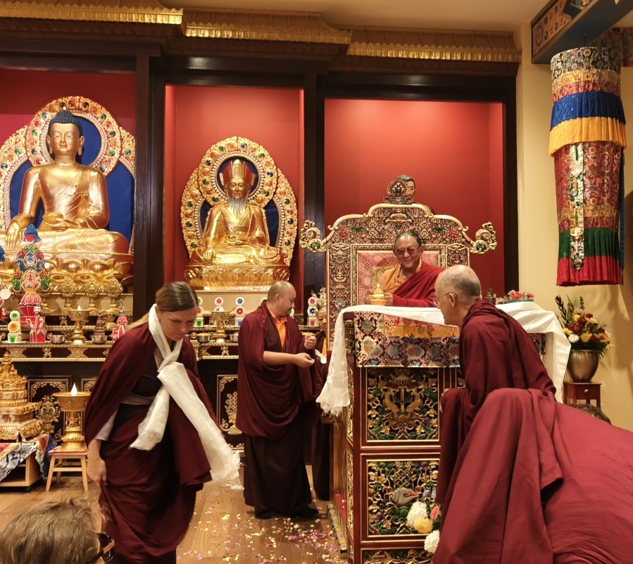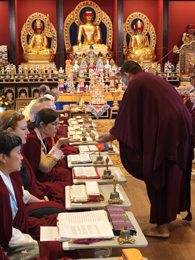 In the summer of 2025 at Mindrolling Lotus Garden, the long-awaited consecration of the newly built temple, Mindrol Gatsal, took place. Mindrolling Lotus Garden sangha members gathered from around the world to take part in this wonderful occasion. The process began with the elaborate po chog, the ritual for transferring the sacred contents, blessings, and siddhis from the old shrine room to the new temple. The po chog was held on the 16th of August, 2025. The ritual centers around the melong, or mirror, that serves as the physical support to gather the jnanasattvas and their blessings that the old shrine room has been imbued with over years of practice, studies, teachings, and transmissions. The melong is then covered in cloth in the colors of the Five Buddha Families and brought in a ceremonial procession from the old temple into the new temple.