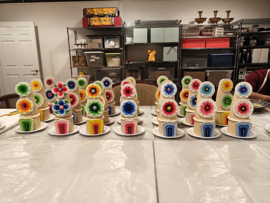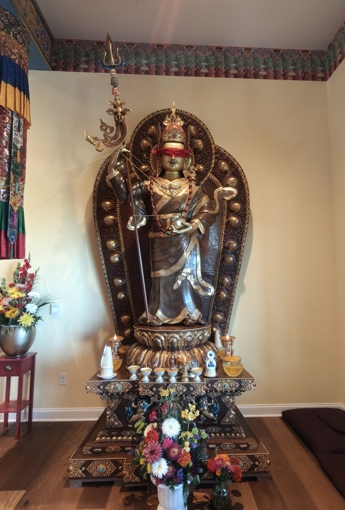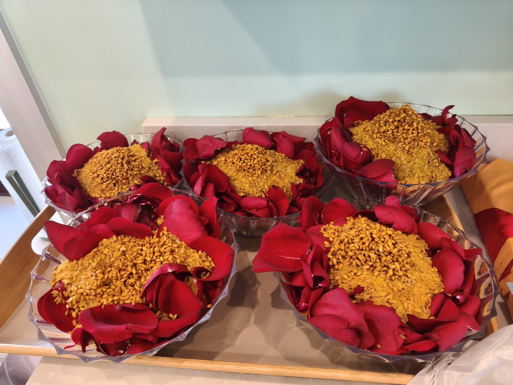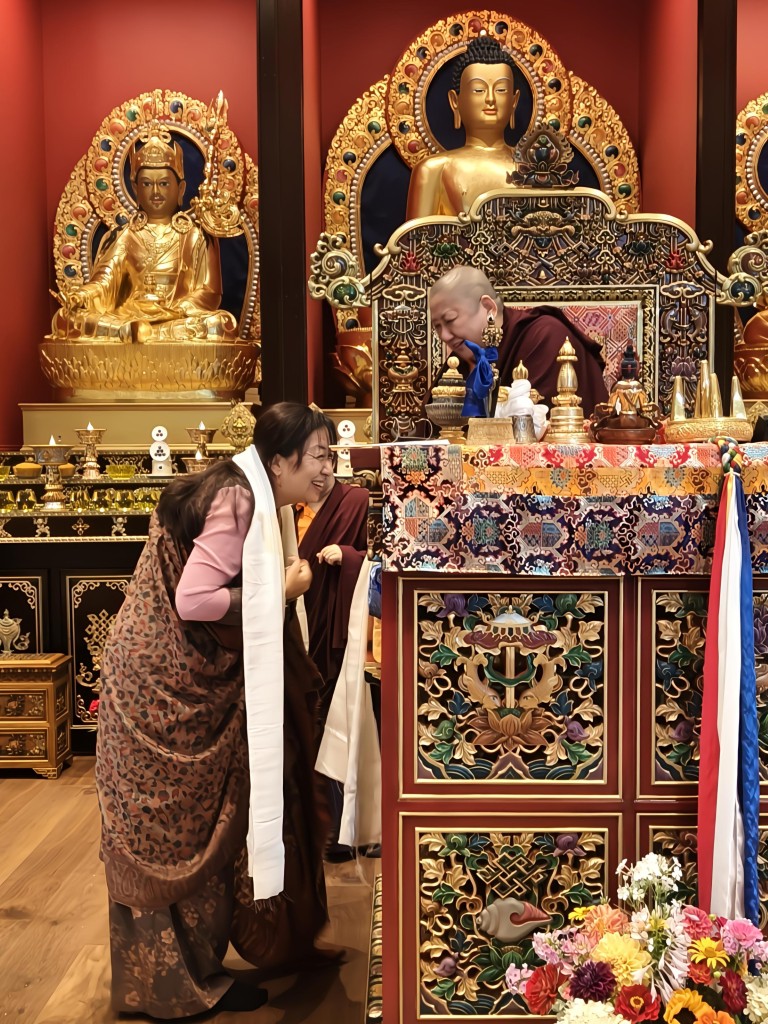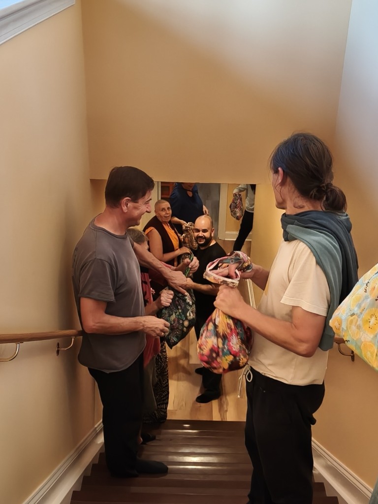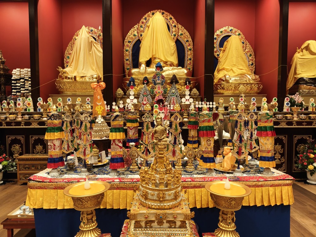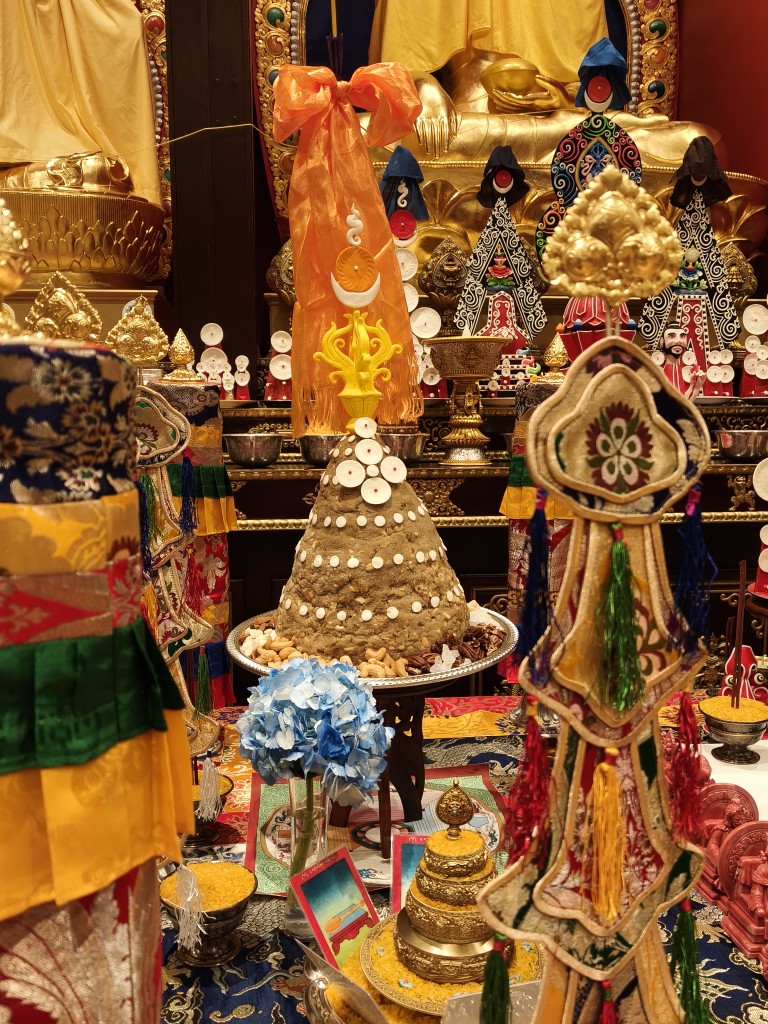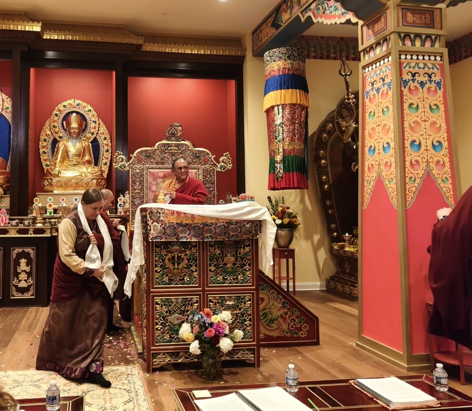 In the summer of 2025 at Mindrolling Lotus Garden, the long-awaited consecration of the newly built temple, Mindrol Gatsal, took place. Mindrolling Lotus Garden sangha members gathered from around the world to take part in this wonderful occasion. The process began with the elaborate po chog, the ritual for transferring the sacred contents, blessings, and siddhis from the old shrine room to the new temple. The po chog was held on the 16th of August, 2025. The ritual centers around the melong, or mirror, that serves as the physical support to gather the jnanasattvas and their blessings that the old shrine room has been imbued with over years of practice, studies, teachings, and transmissions. The melong is then covered in cloth in the colors of the Five Buddha Families and brought in a ceremonial procession from the old temple into the new temple.