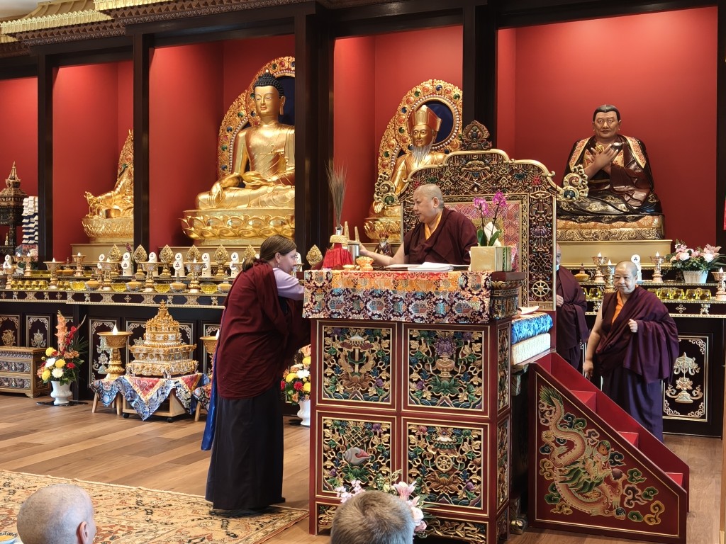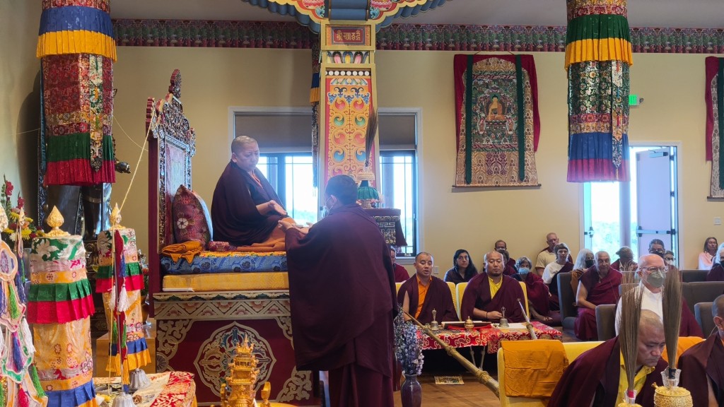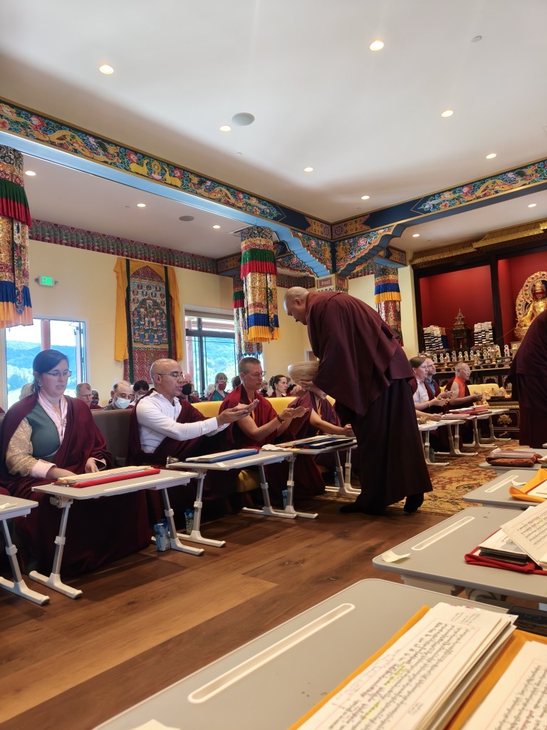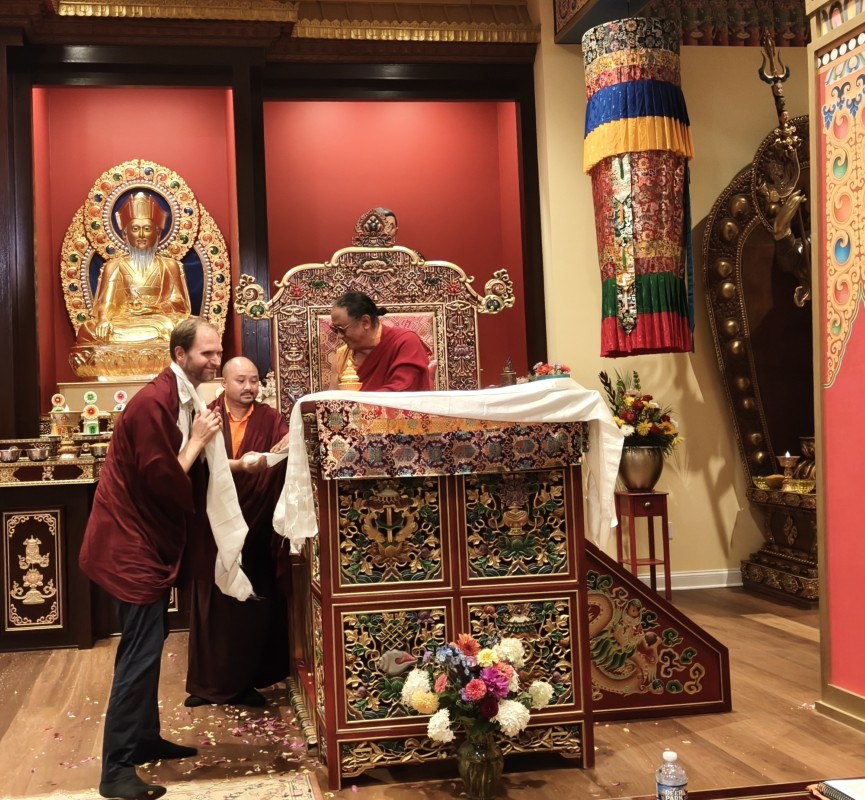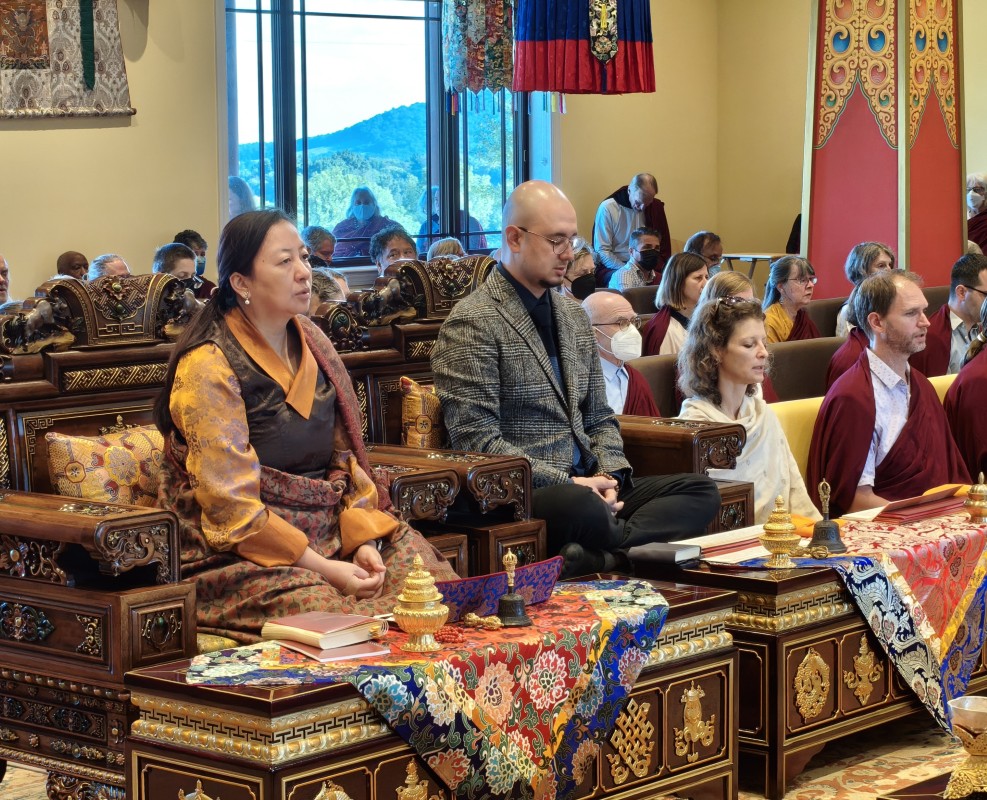 The transmissions concluded with Jetsün Khandro Rinpoche expressing deep gratitude to His Eminence Dzigar Kongtrul Rinpoche and the offering of mandala and ten sum to His Eminence by Dungse Rinpoche and Jetsün Rinpoche.