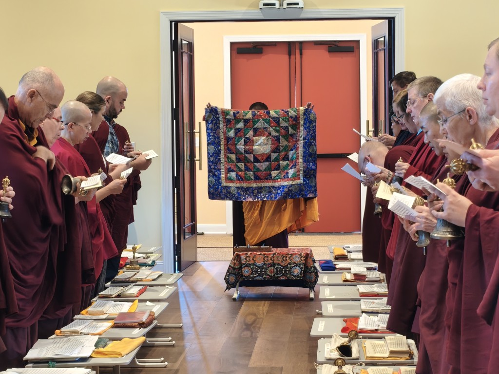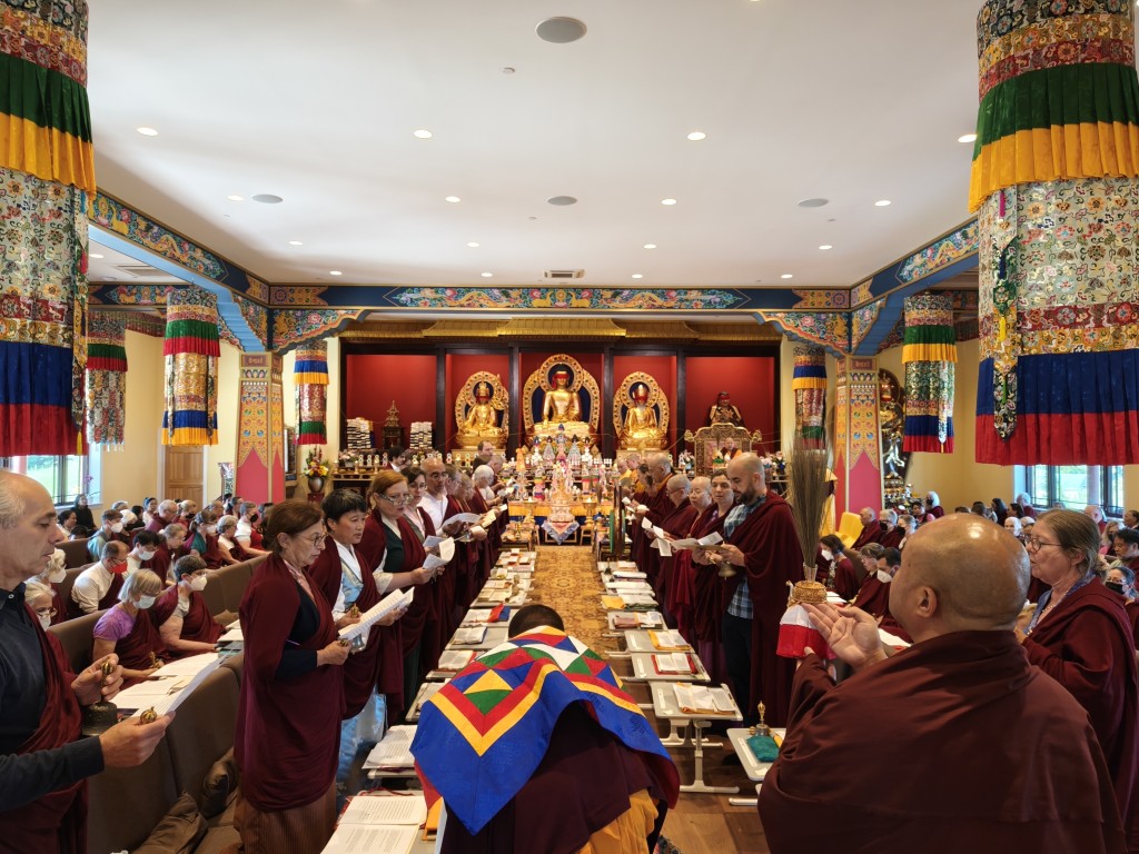 The ritual continued in the main shrine room of the new temple named Ngedon Gatsal, the Joyous Garden of Definitive Meaning. The mirror was uncovered and the jnanasattvas and their blessings were dissolved into the representations in Ngedon Gatsal, thus ensuring the seamless continuity of the wisdom beings’ presence.