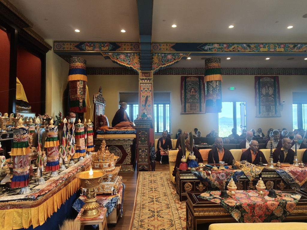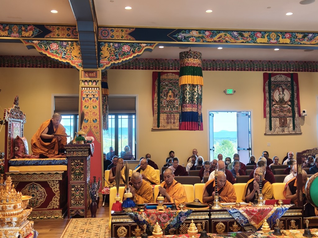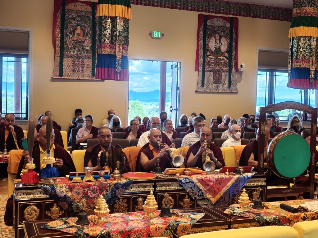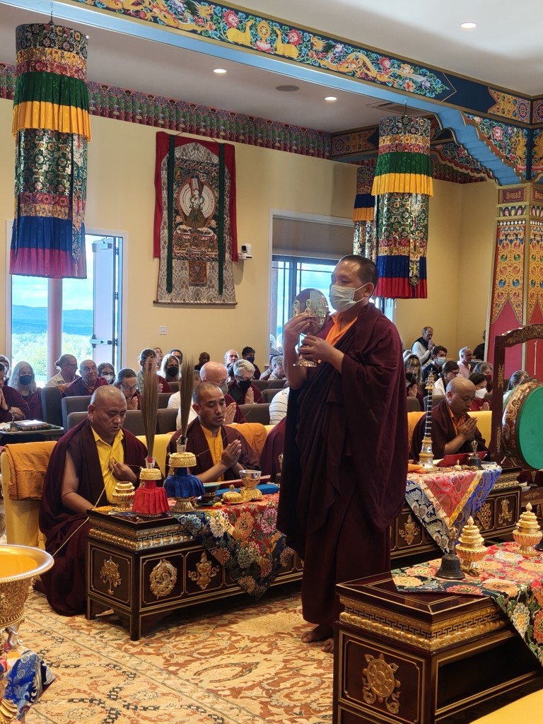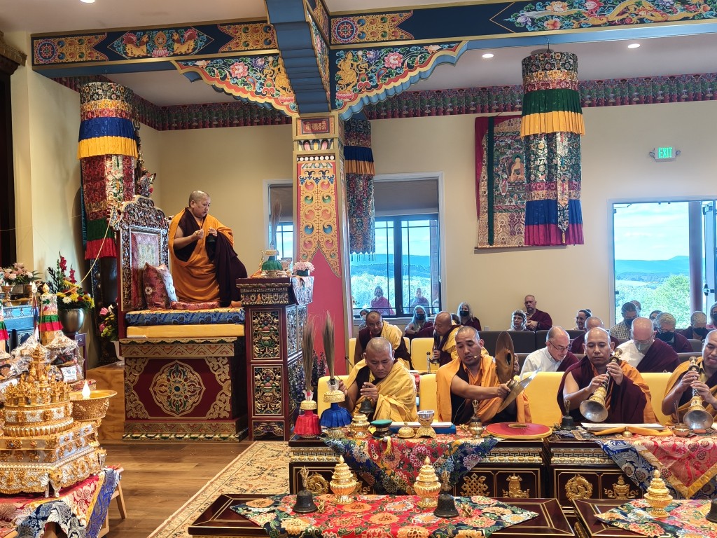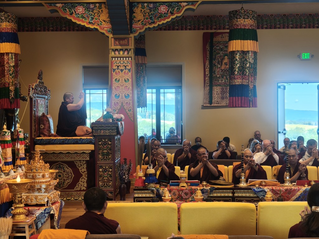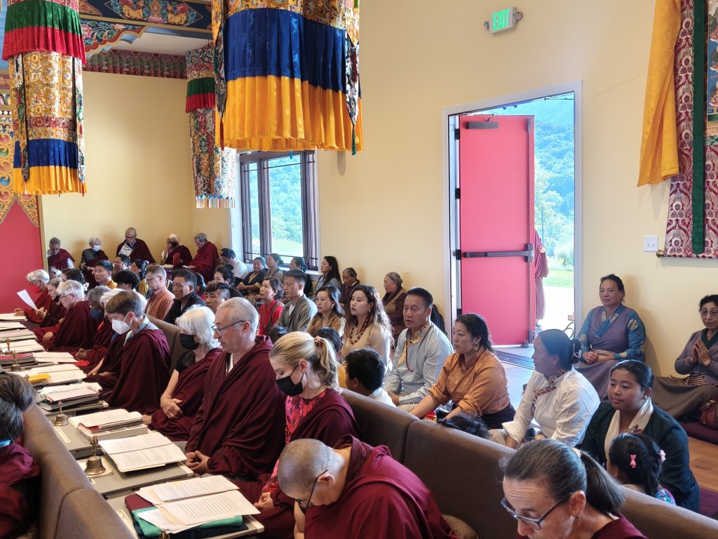 It was a wonderful celebration as the ritual was brought to conclusion. The gathered Rinpoches, monks, nuns, and lay practitioners practiced together in harmony and joined in the sincere aspiration that Mindrol Gatsal will be a place to hold and support the practice and transmission of the authentic Buddhadharma far into the future. The auspicious and joyful sedreng and blessing rituals were performed, and the entire environment blossomed fully with blessings and auspiciousness. This event marks an extraordinary landmark in the history of Mindrolling and the establishment of Mindrolling in the West. The vision of Mindrolling as the source of pure Dharma, a vessel for authentic and unadulterated transmissions, a place for deepened studies and practice, and wholehearted training manifested on the land of Pema Gatsal.