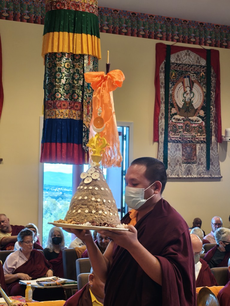 This most extensive rabne ritual, accomplished according to the tradition of Terdag Lingpa, comprised three days of intensive practice, beginning on the auspicious 8th lunar day of the 7th lunar month. Hundreds of sangha members joined in the ceremonies including over a hundred members of the local Virginia Tibetan community. The final day of the rabne fell on the auspicious Guru Rinpoche Day (the 10th lunar day), and to the great good fortune of the gathered assembly, His Eminence Dzigar Kongtrul Rinpoche presided over the rabne ritual on this auspicious.