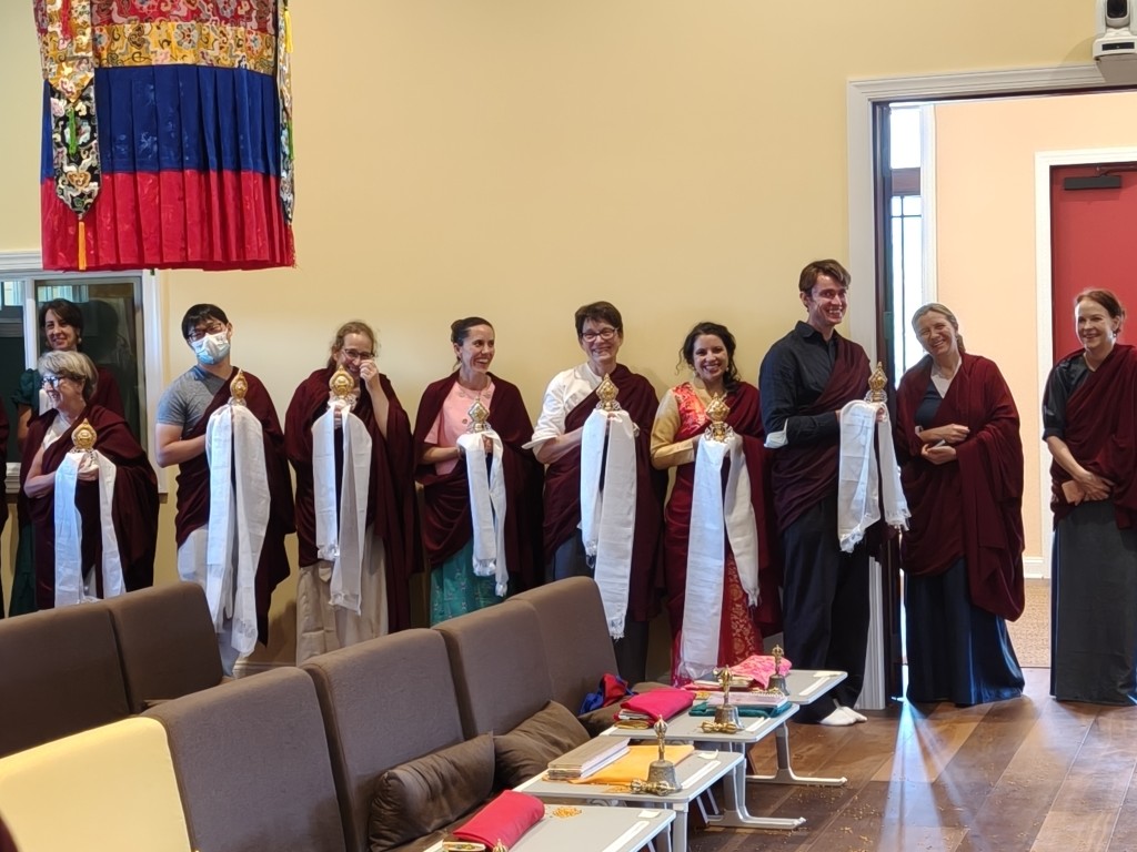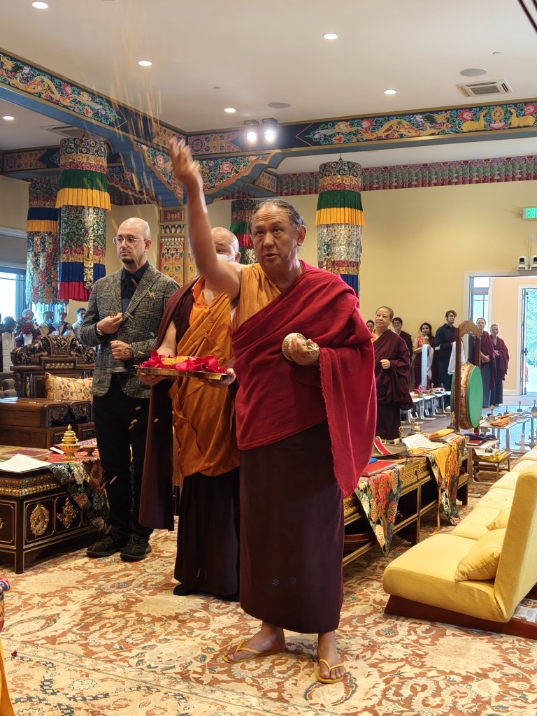At the conclusion of the po chog, Rinpoche addressed the gathered assembly and the many sangha members who joined the online live stream. Rinpoche particularly thanked Jetsünla for her great vision, leadership, and tireless efforts for the sangha of Lotus Garden, Britton la for his wonderful dedication in overseeing the temple construction project, the many monks and nuns who have worked tirelessly in ensuring the completion of the temple, and the core members of administrative team for their service to the lineage and to Lotus Garden.