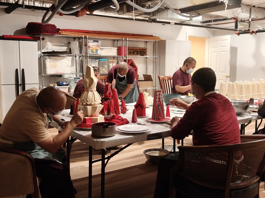 Parallel to the Practice Intensive Retreat, the many khenpos and senior monks of Mindrolling together with chöpons of Pema Gatsal began the preparation for the rabne ritual, the actual consecration of the temple. The new shrine rooms were filled with abundant offerings and tormas, and the elaborate mandala was created as the support for the practice. One continuous zung thag (mantra thread) was tied around every shrine and sacred representation in Mindrol Gatsal and then around the entire temple itself.