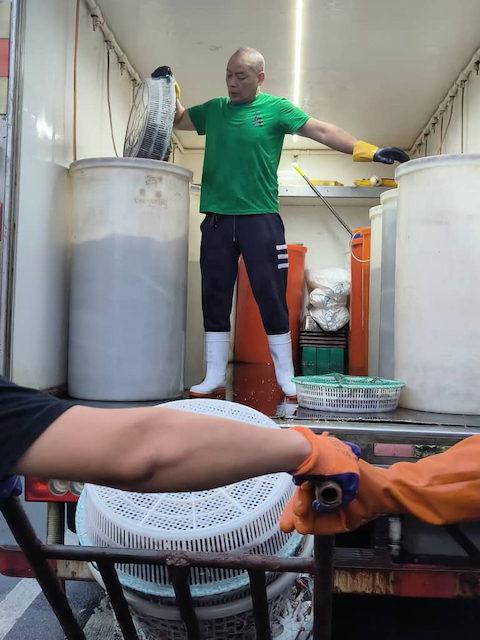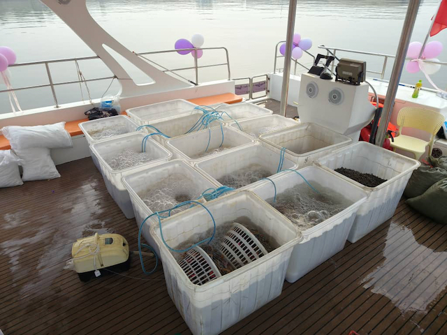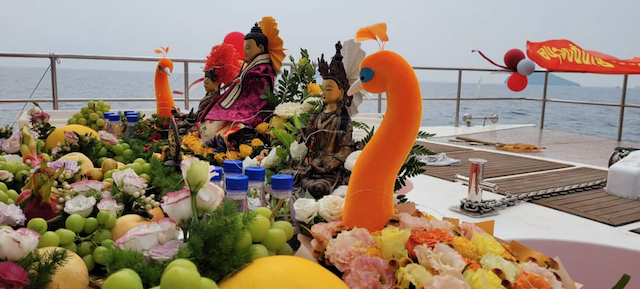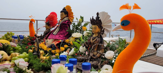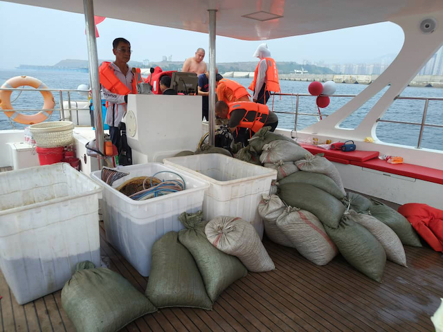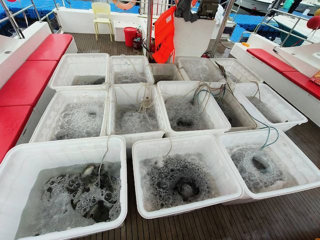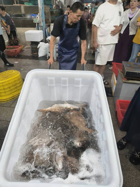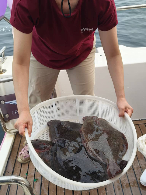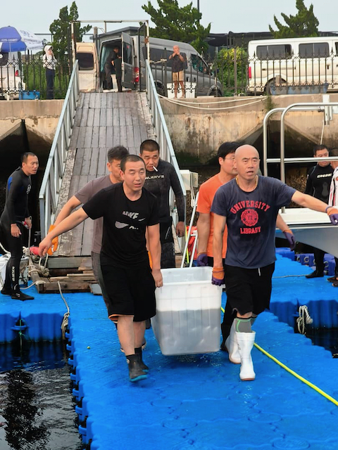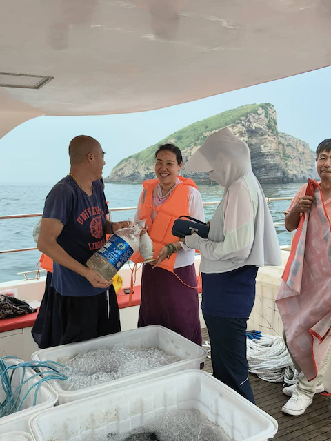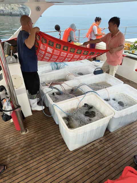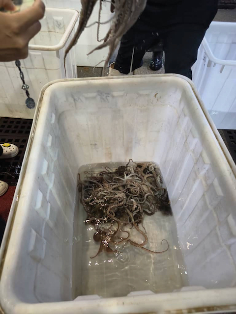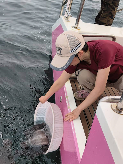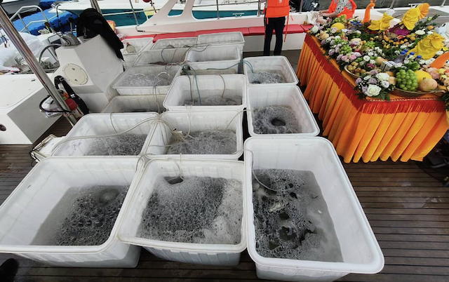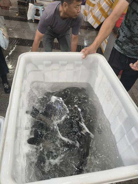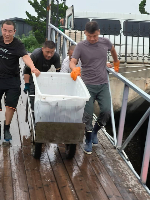 Early on the morning of August 19, 2023, the team at One Aspiration Life Saving Center went to the live fish market and began purchasing many filefish, Japanese black porgy, red sea breams/genuine porgy, eelpout fish, white-spotted conger eel, greenling fish/Hexagrammos otakii, rockfish/Sebastes schlegelii, turritella snail/shell, octopus variabilis saski, spotted halibut, tiger puffer/fugu, swimming crab, perigone crab/charybdis japonica, and mantis shrimp. In total, more than 4 million aquatic animals were saved from the market and released back into their natural habitat in areas where fishing is forbidden. Many of these fish are pregnant this time of year, such as the filefish who carry 60,000 eggs, and so even more lives were saved. The worldwide sangha donated more than US $30,000 that funded this life release.