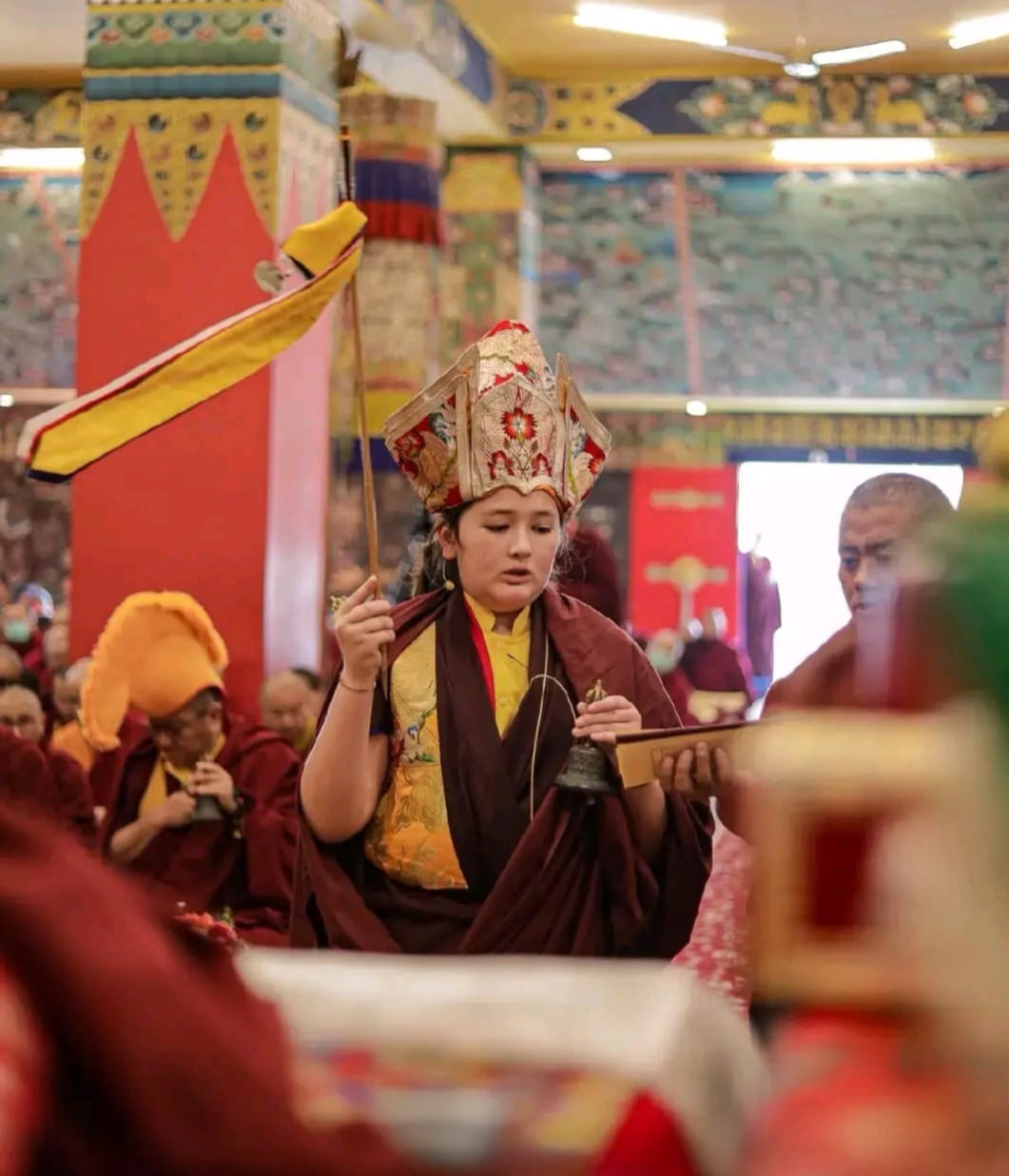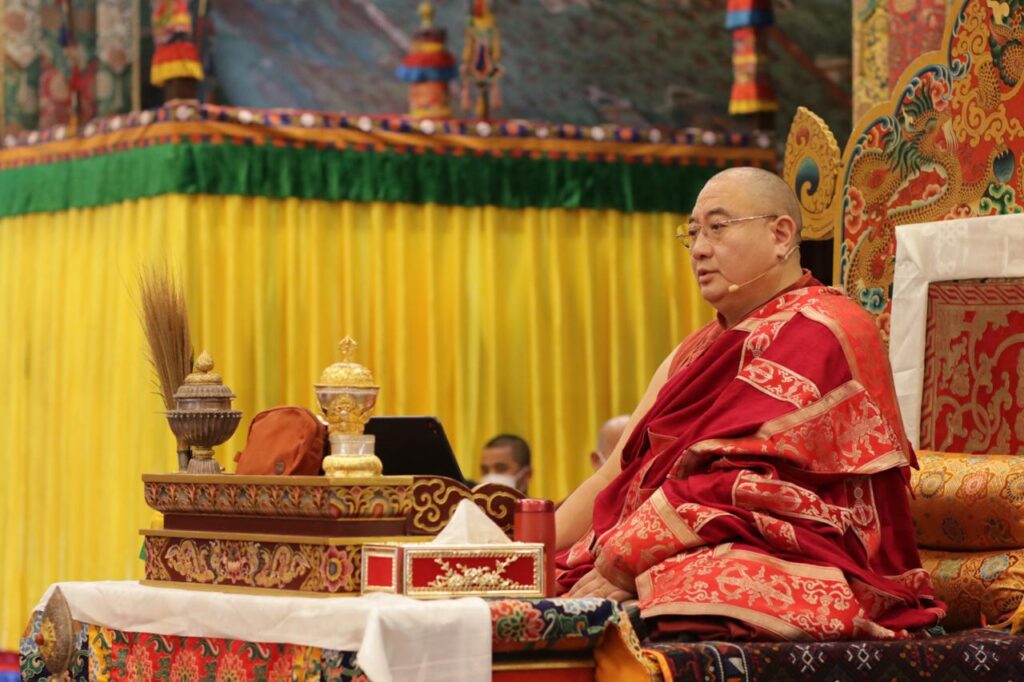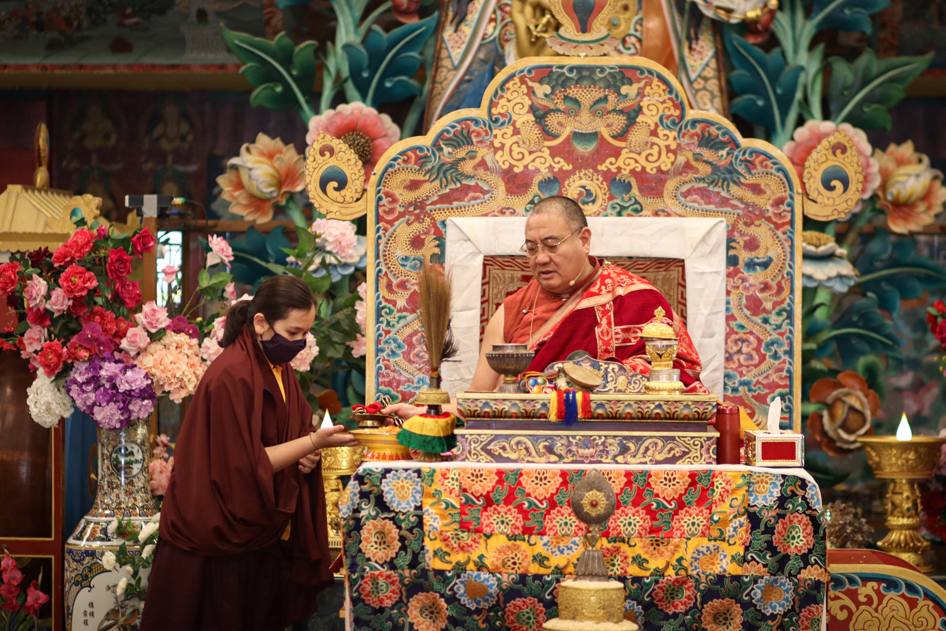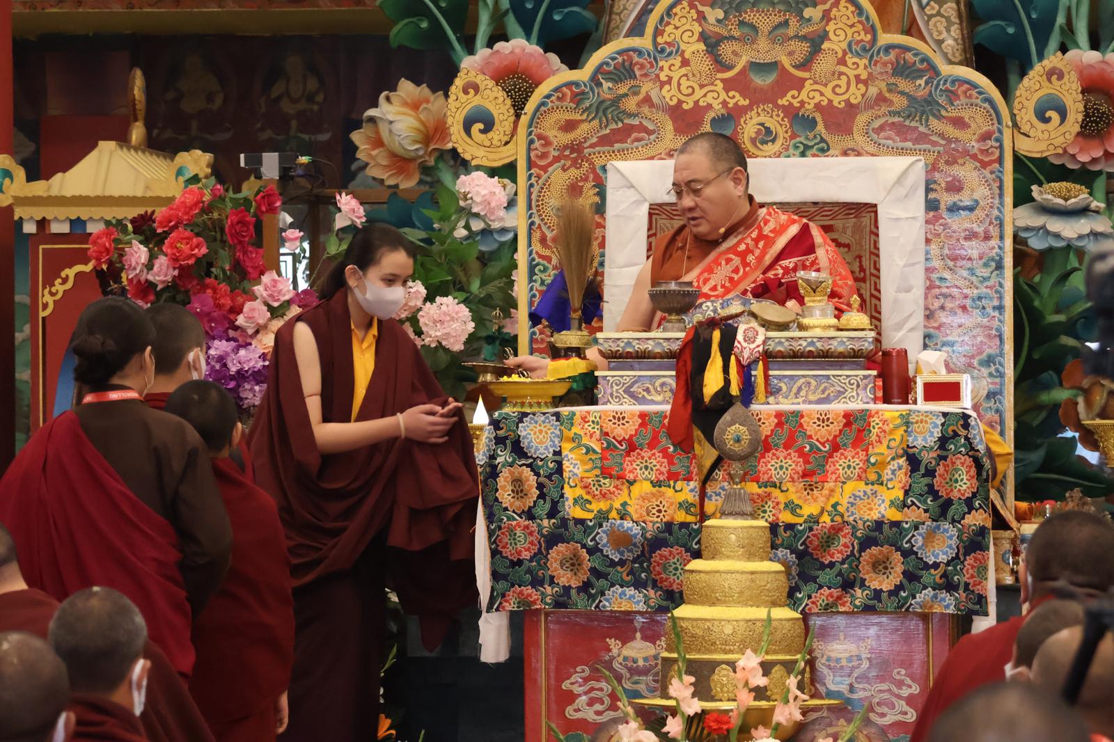 As the transmissions reached the section of the higher tantras, the young tulkus auspiciously bestowed the wangdrim all together. In a moment of historical significance, Minling Jetsün Rinpoche also joined the bestowal of the wangdrim, which was a most auspicious occasion, as in the history of the Dharma the Minling Jetsünmas have played a pivotal role in the preservation, protection, and continuation of the teachings.