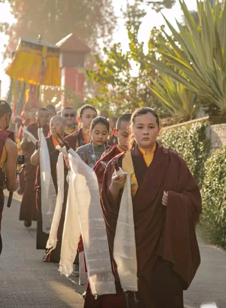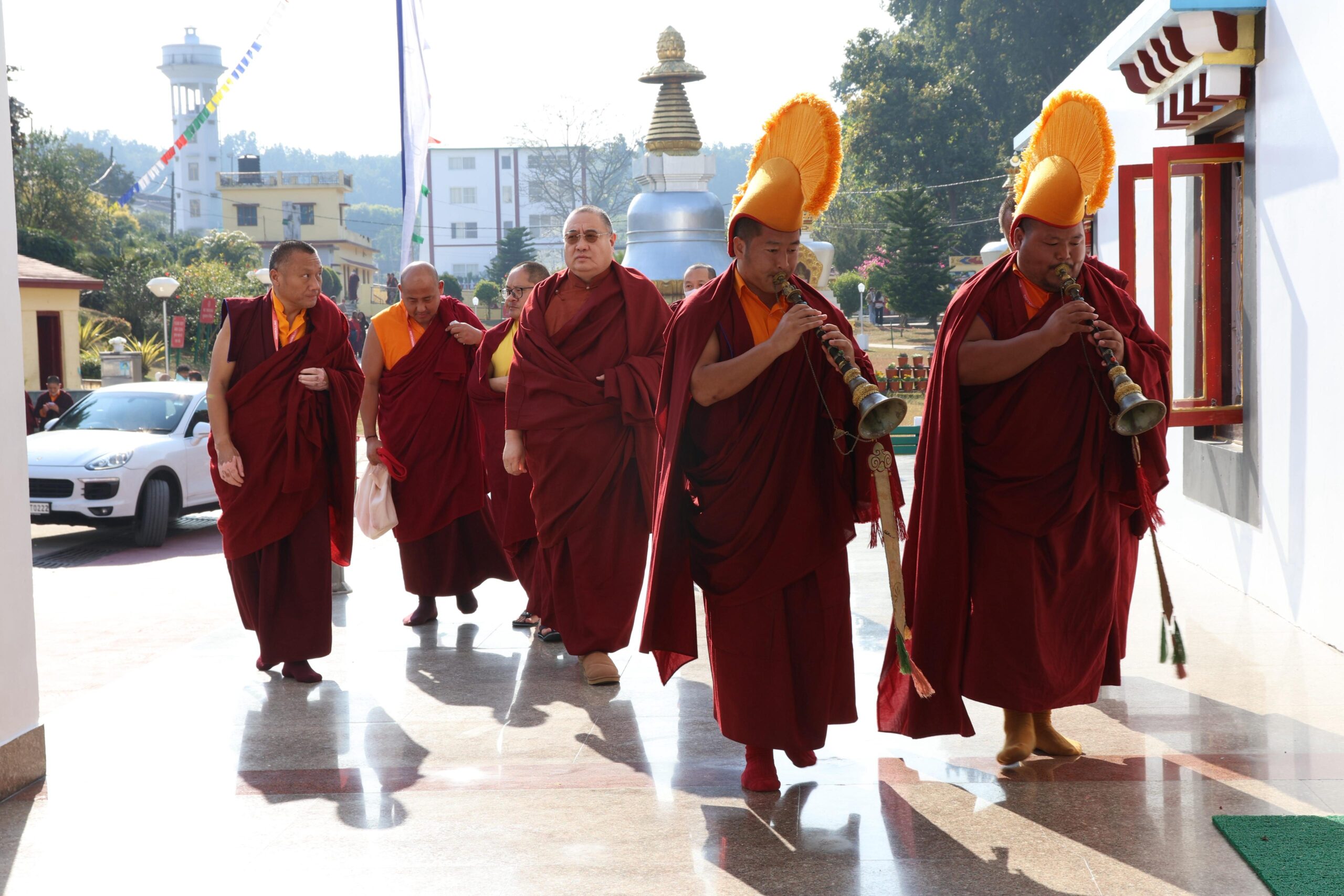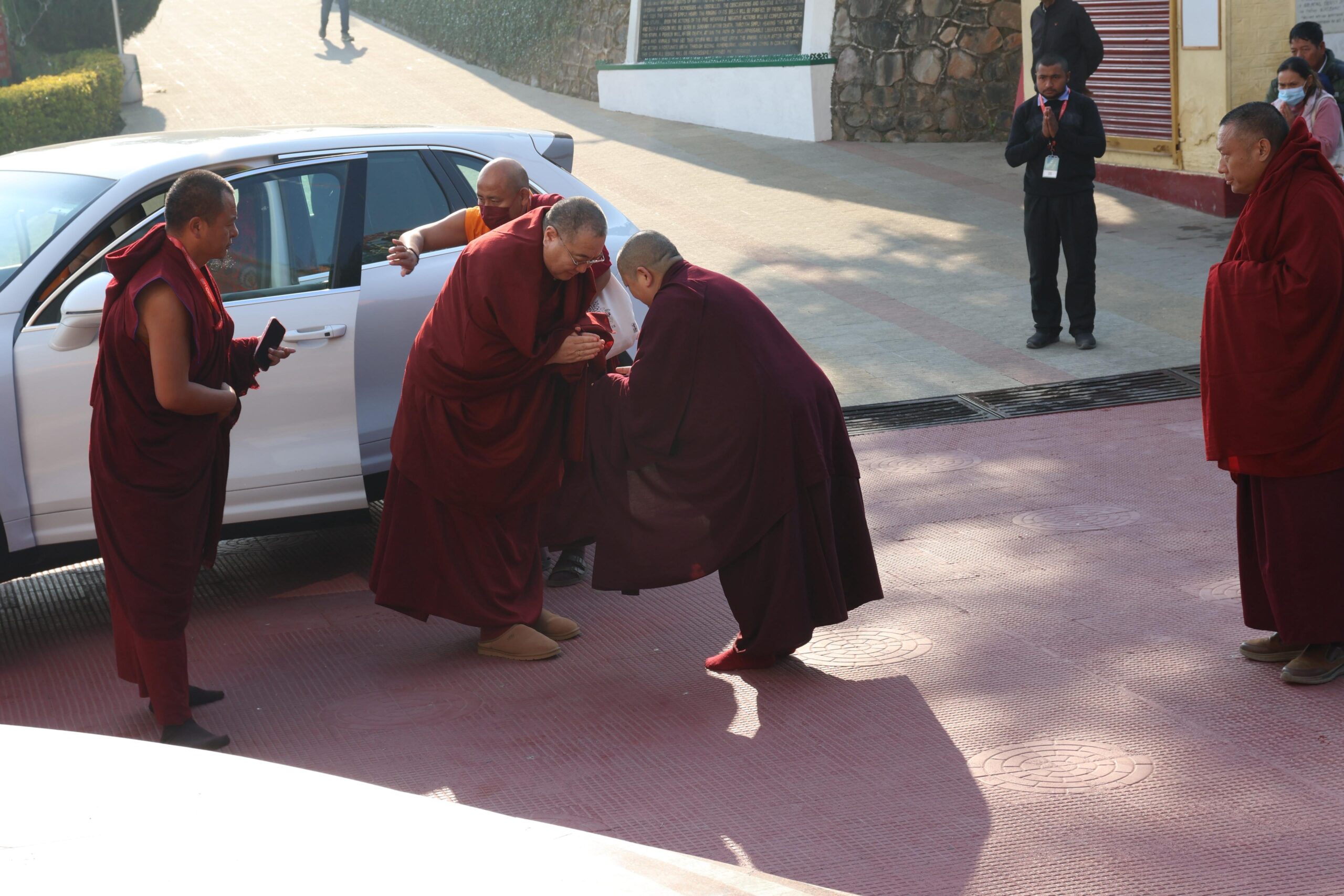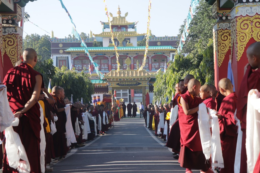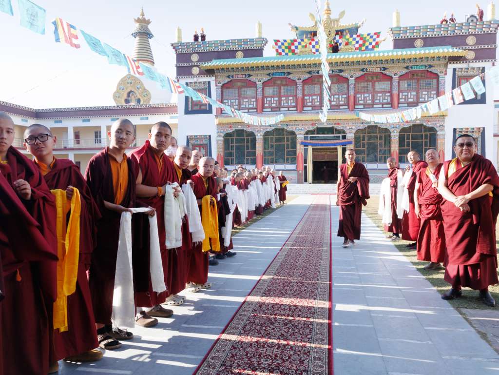 On November 28th, Mindrolling Monastery was blessed with the arrival of Kyabje Sechen Rabjam Rinpoche who was welcomed by all the great masters, rinpoches, yangsis, tulkus, khenpos, monks, nuns, ngakpas, and a vast gathering of devoted practitioners. As the multicolored cloth banner hung proclaiming the highest honor of Kyabje Rinpoche’s arrival, the gong, gyaling, and dungchen resounded, and the formal welcoming procession for Kyabje Rabjam Rinpoche entered the monastery grounds.