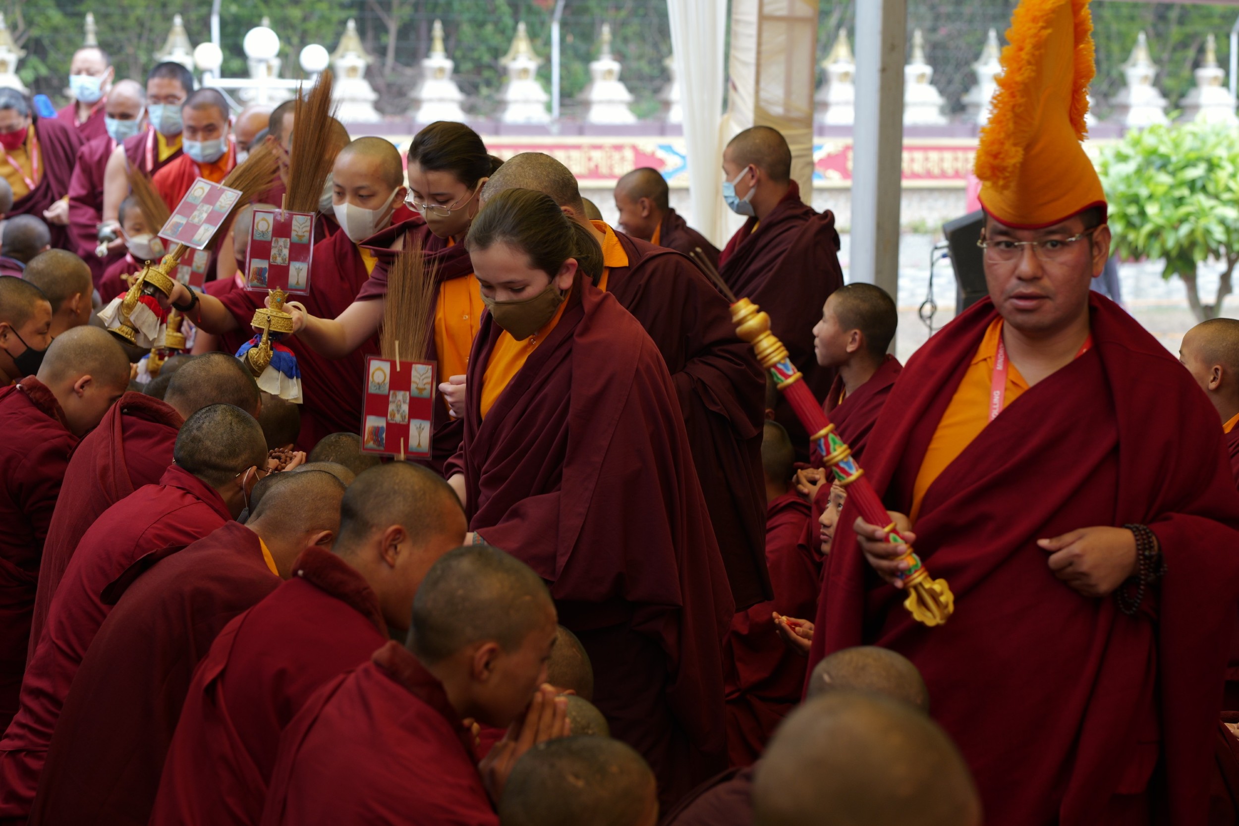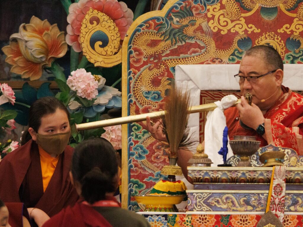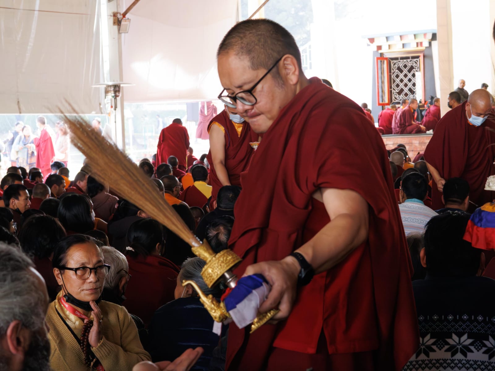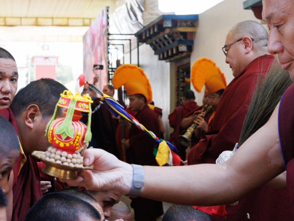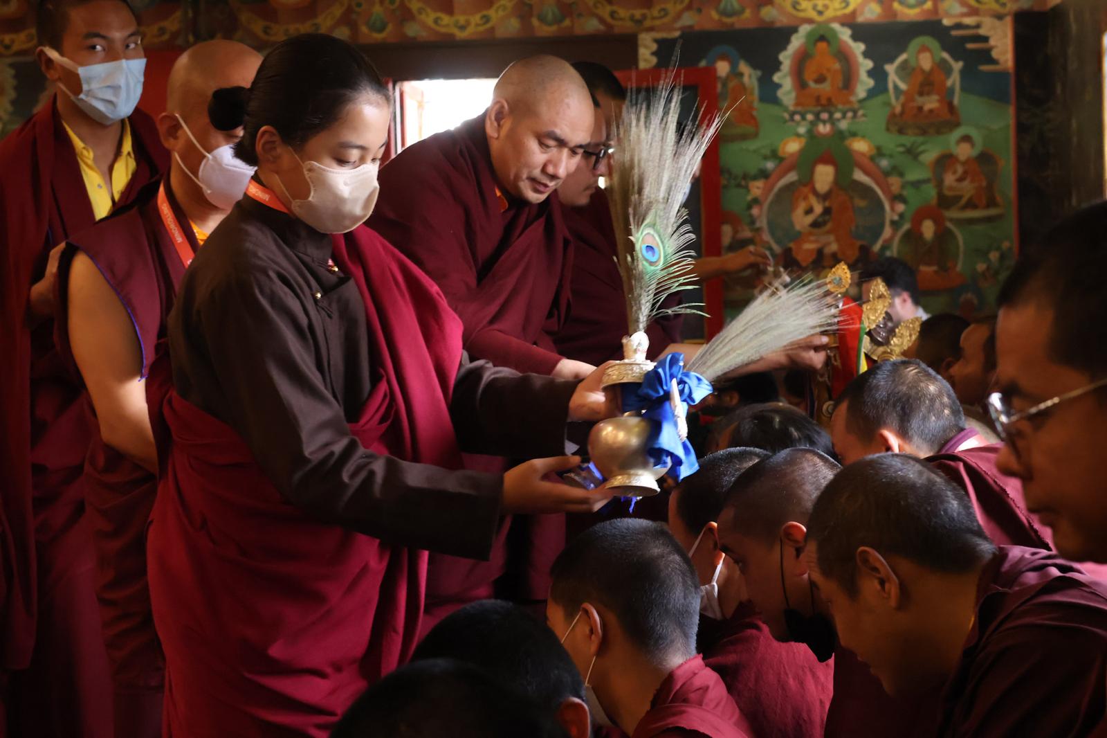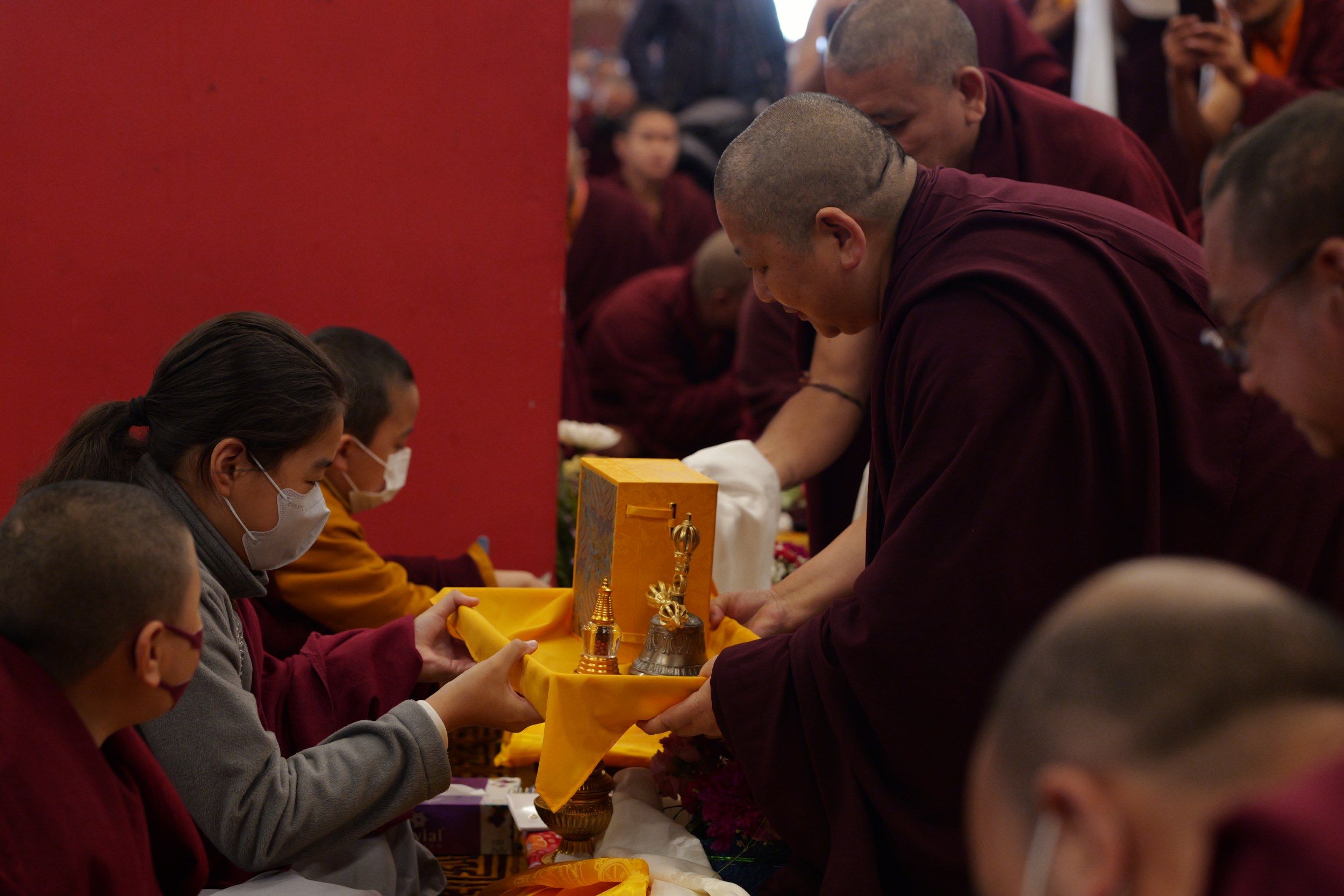 During these afternoon sessions, the young generation of teachers, yangsis, and tulkus performed the wangdrim, bestowing the empowerment articles to each person in the assembled sangha.