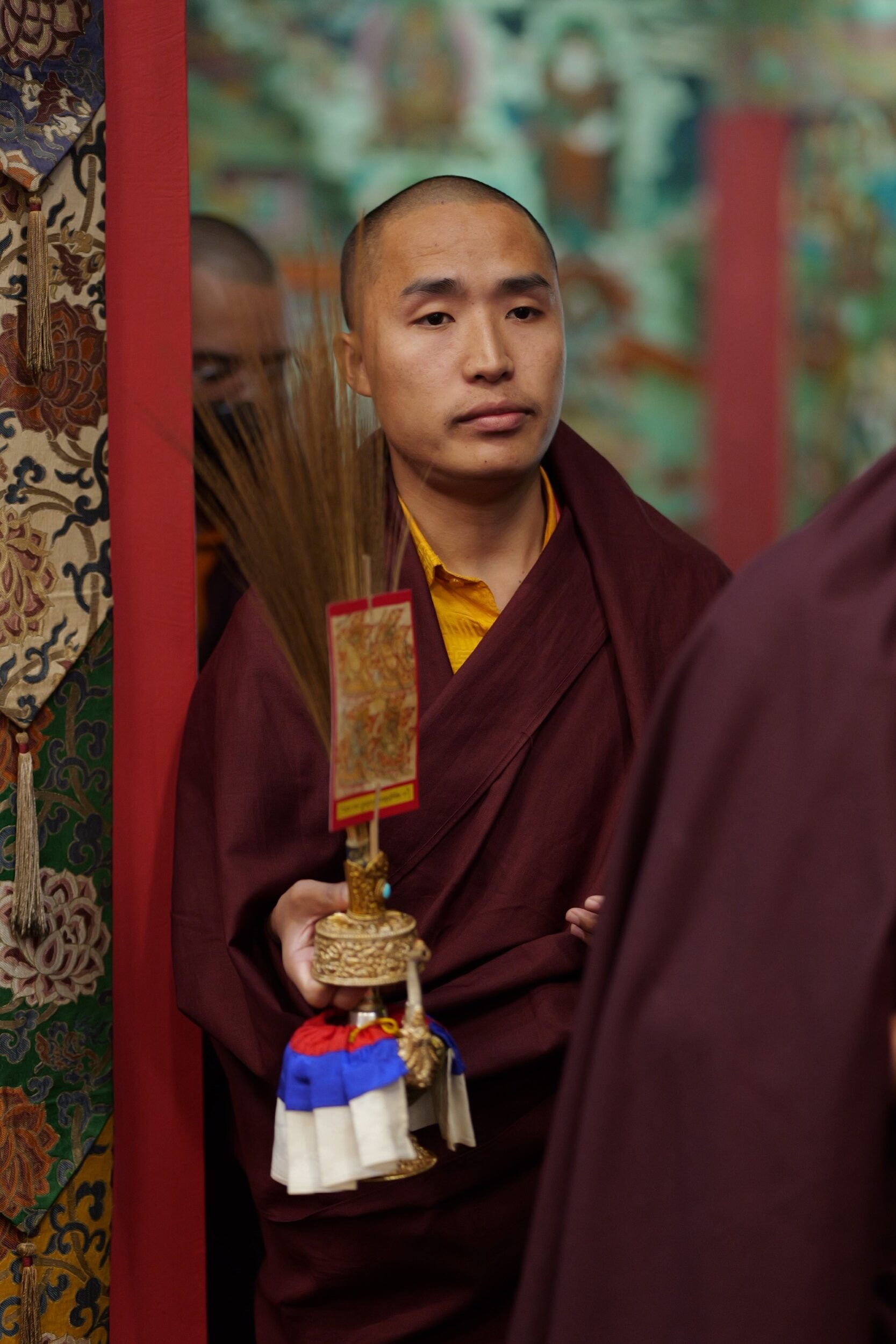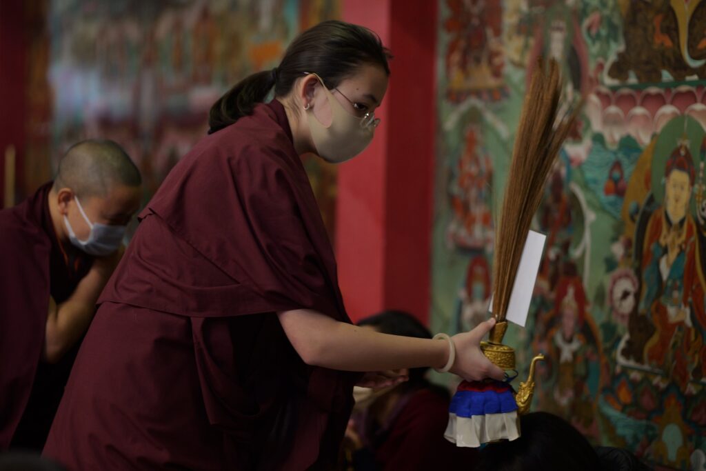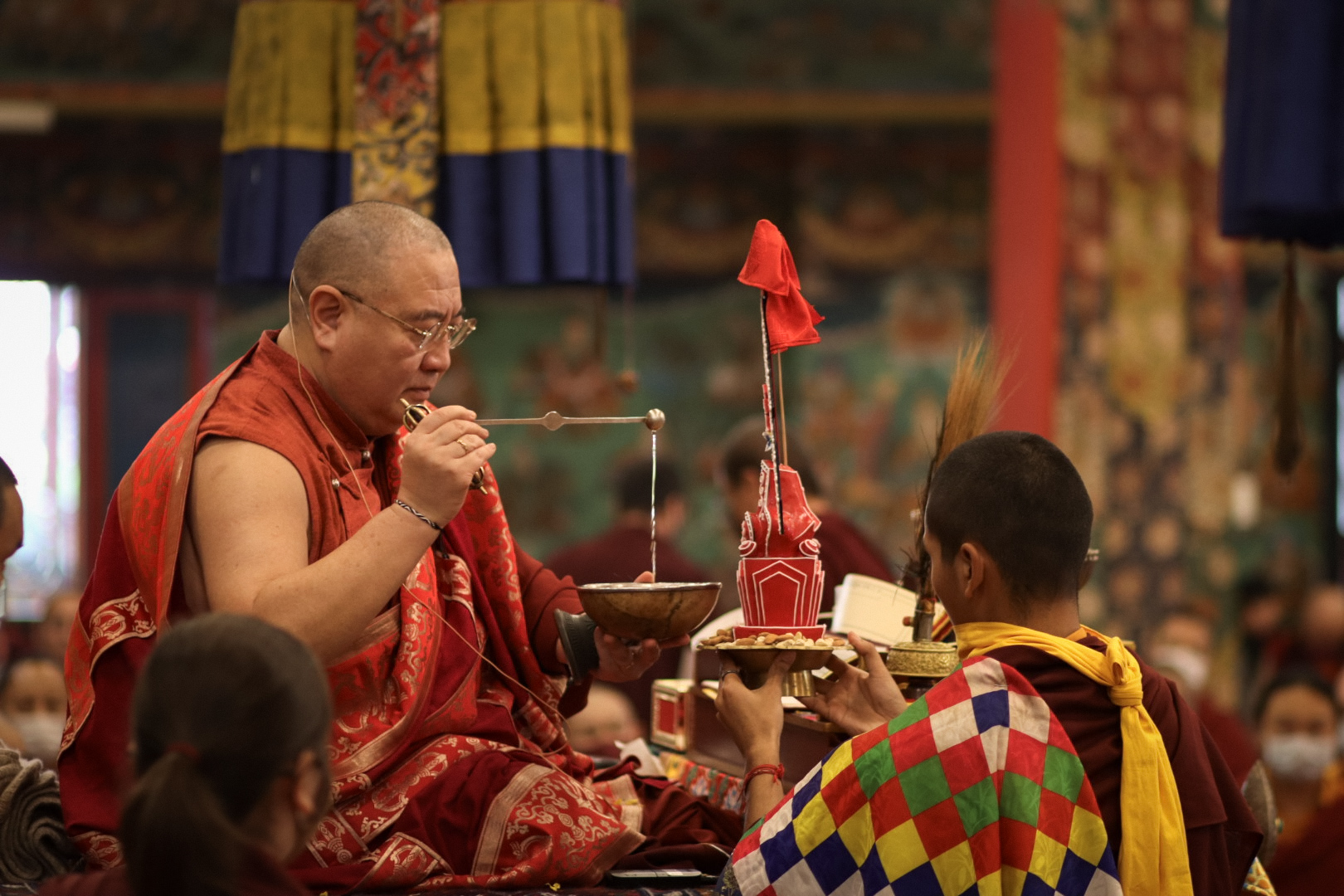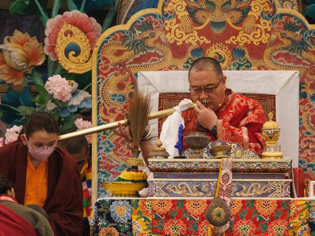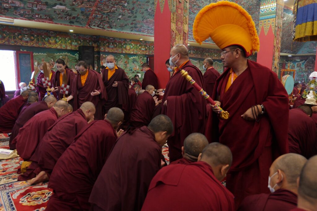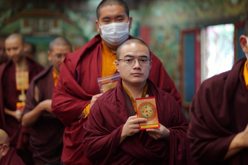 During these afternoon sessions, the young generation of teachers, yangsis, and tulkus performed the wangdrim, bestowing the empowerment articles to each person in the assembled sangha.