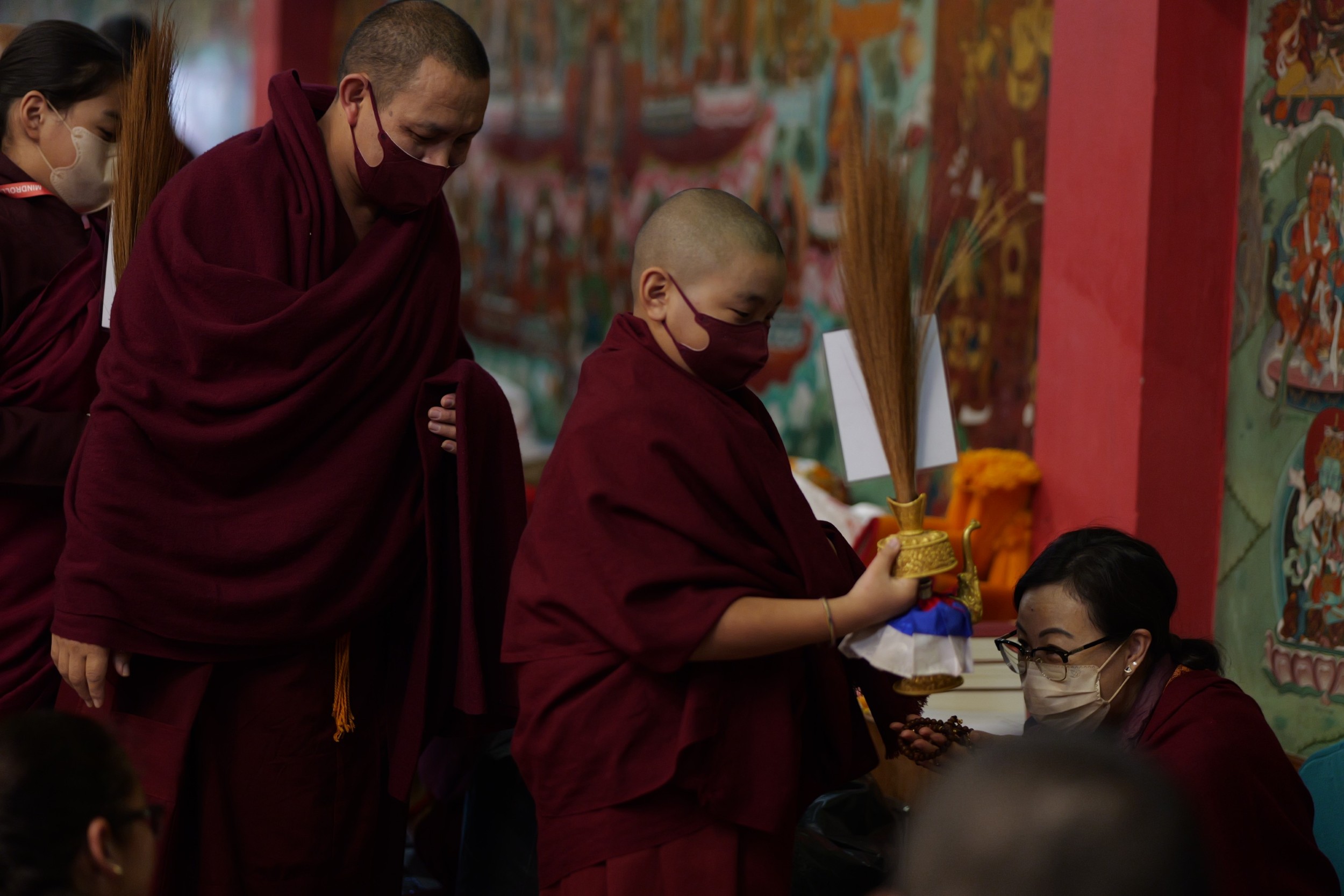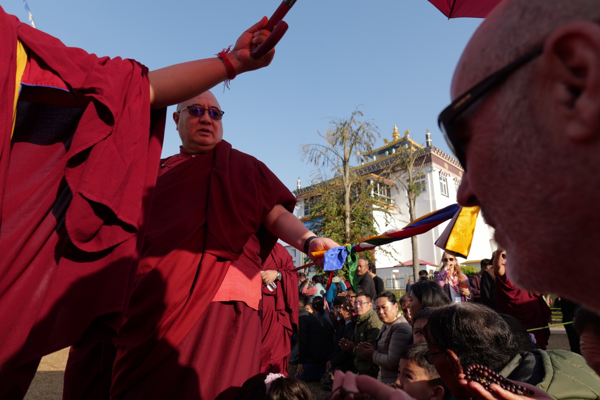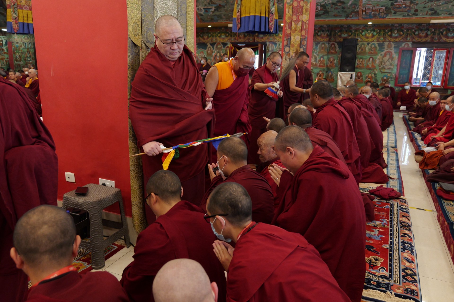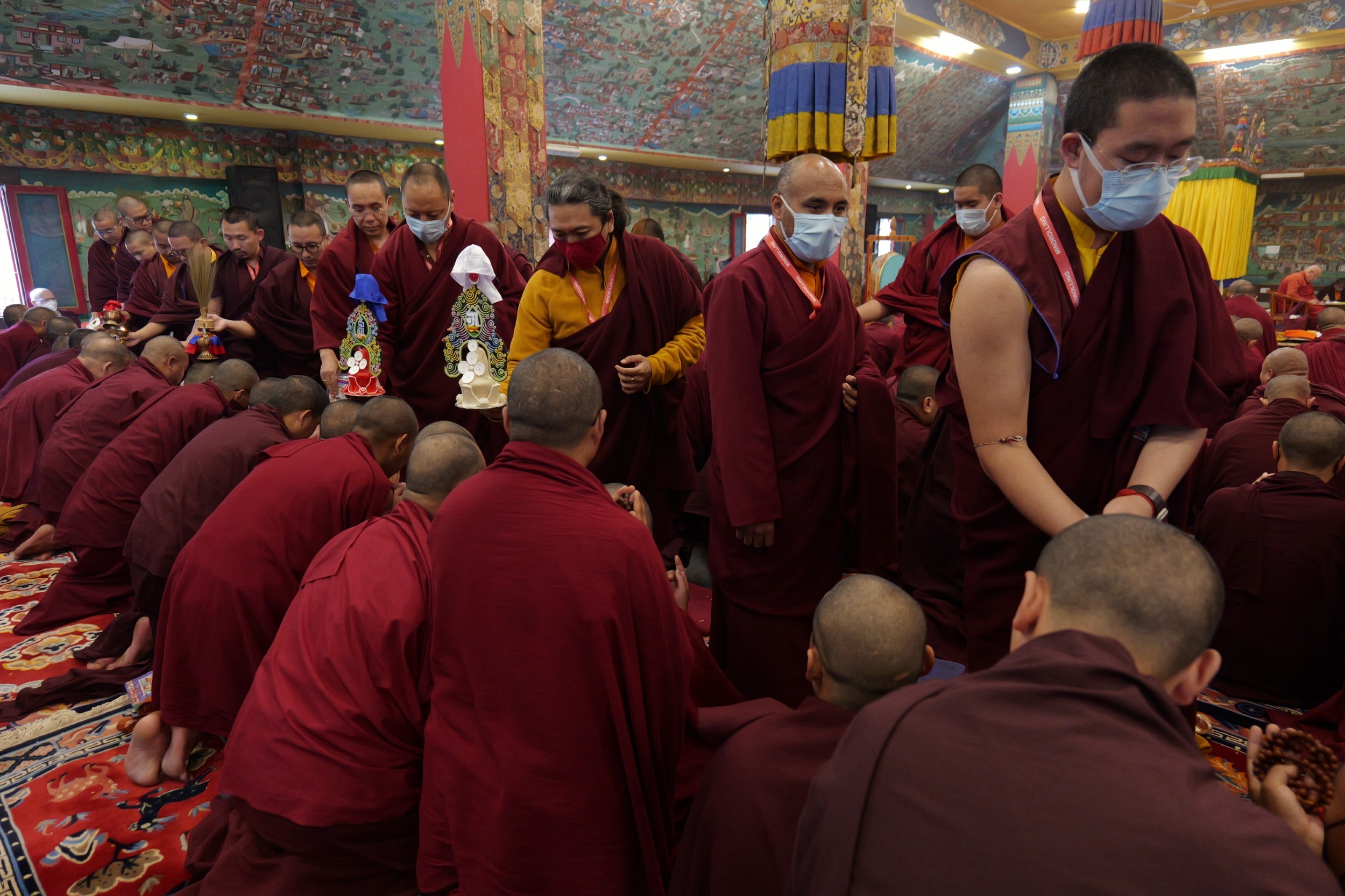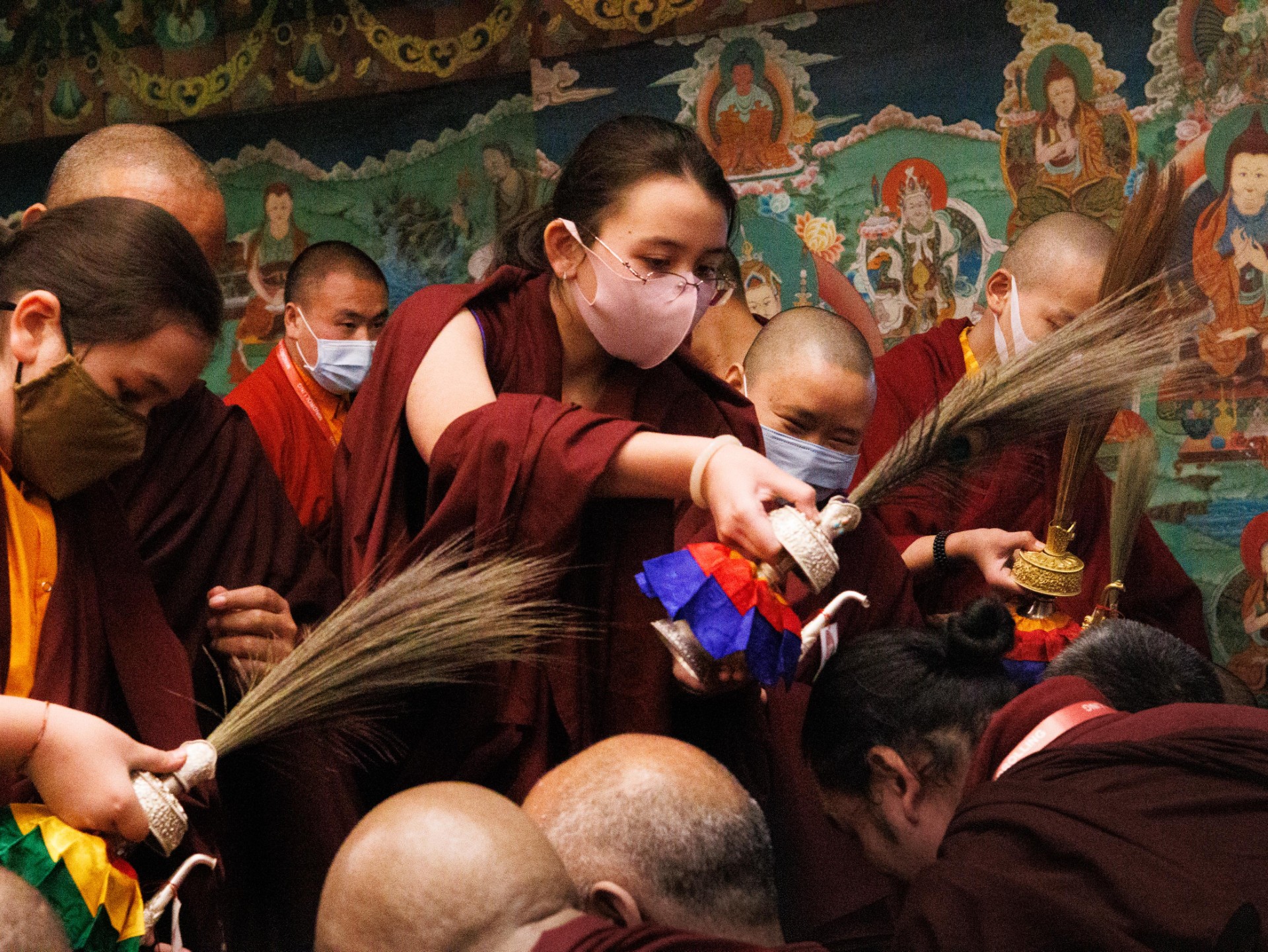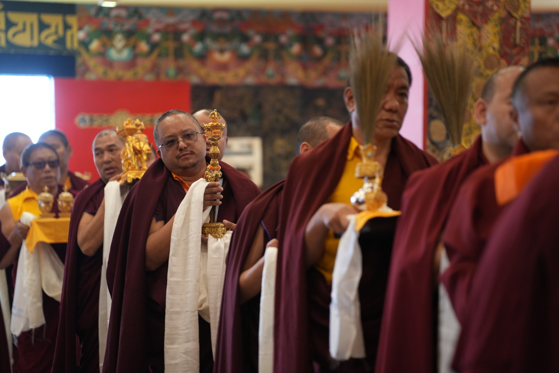 During these afternoon sessions, the young generation of teachers, yangsis, and tulkus performed the wangdrim, bestowing the empowerment articles to each person in the assembled sangha.