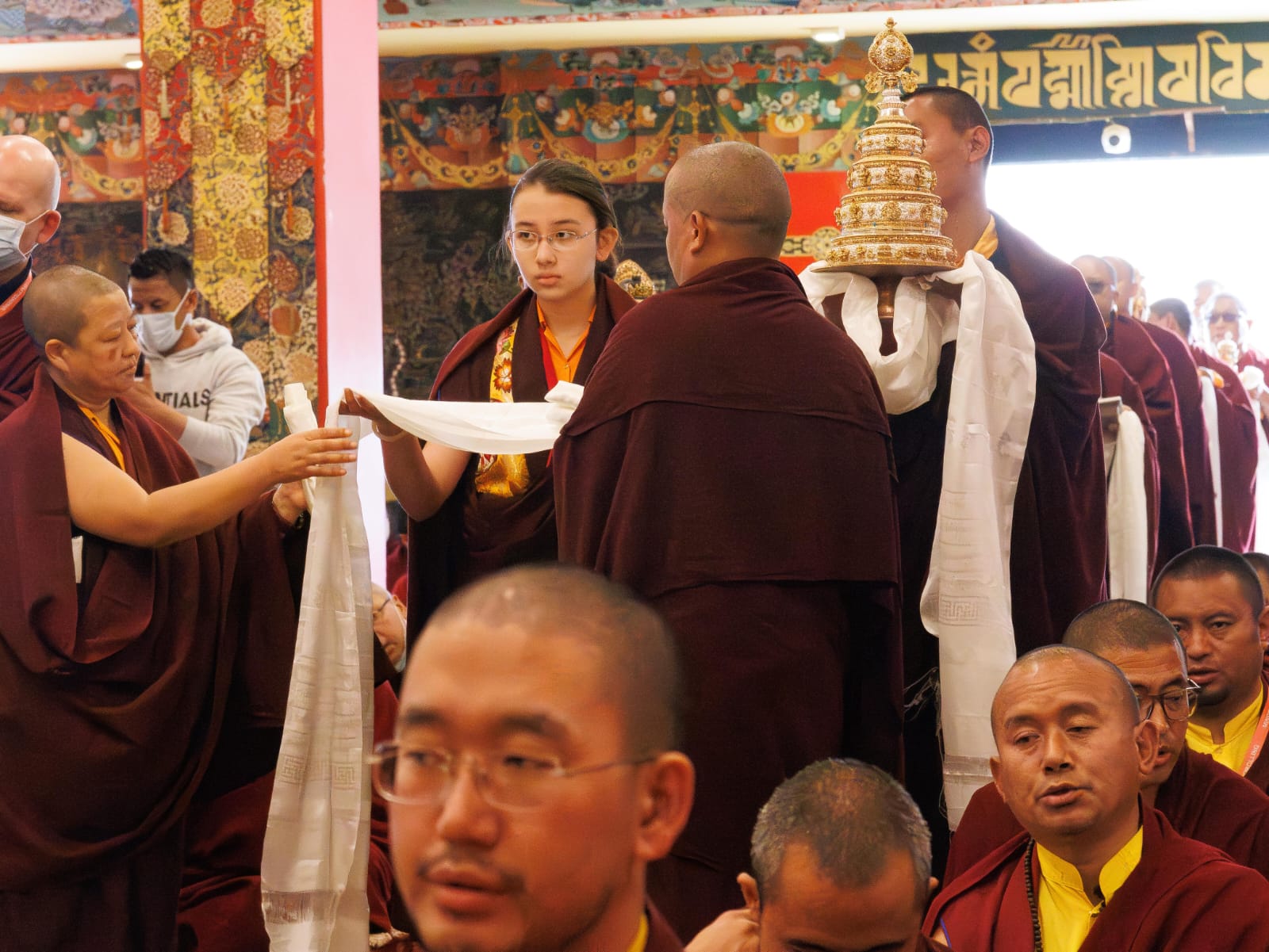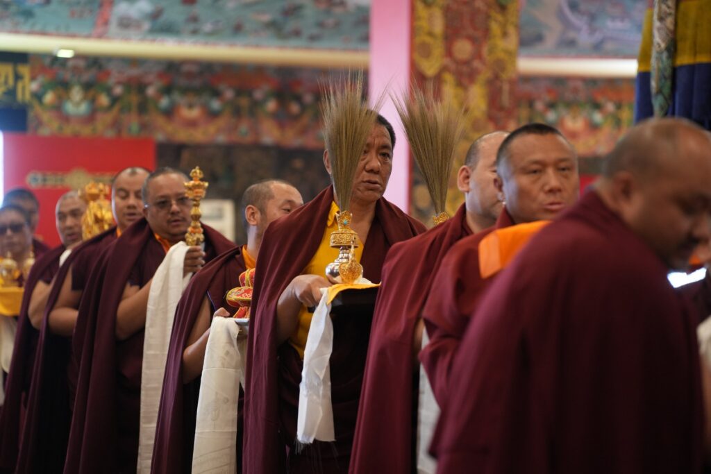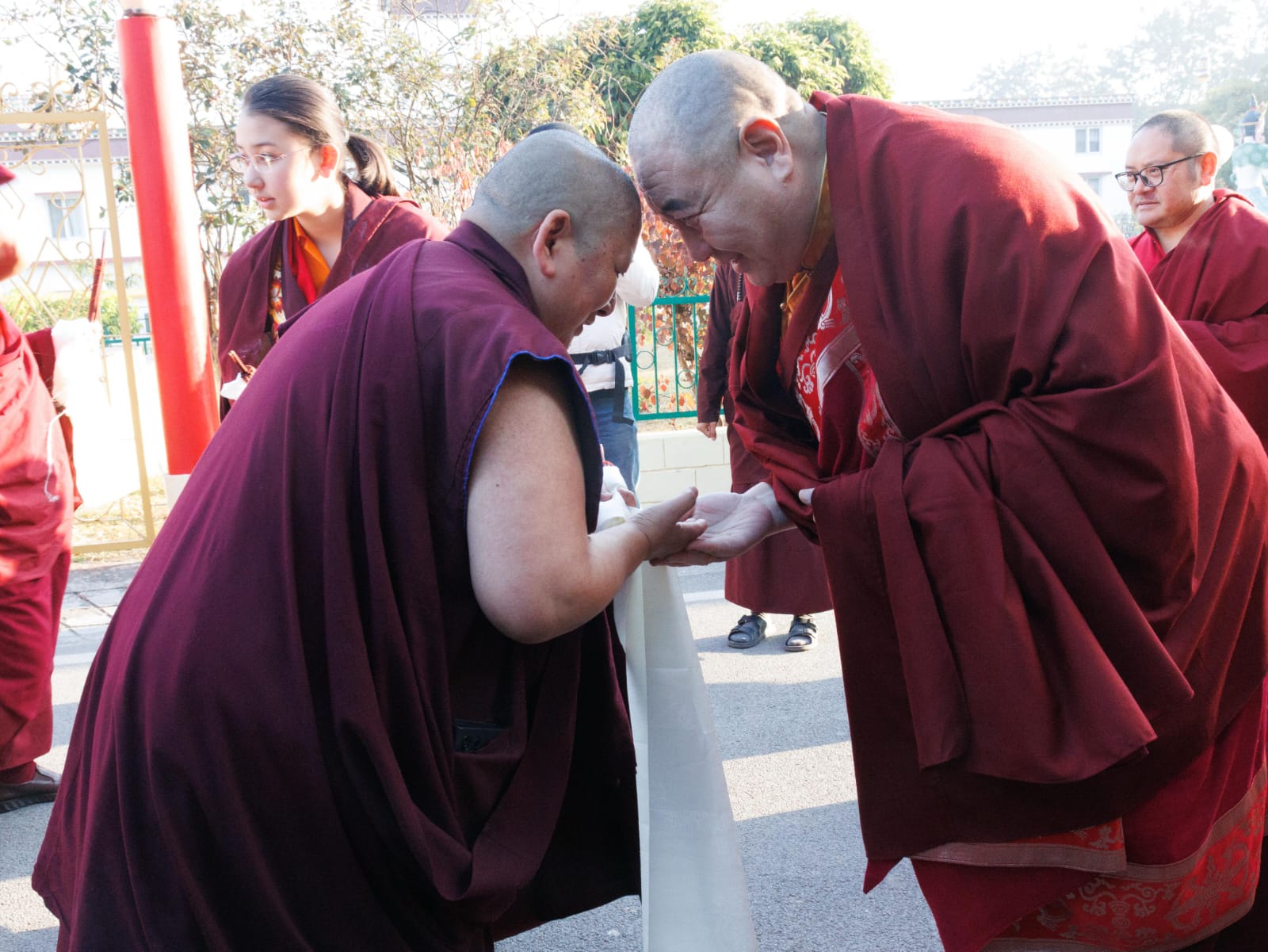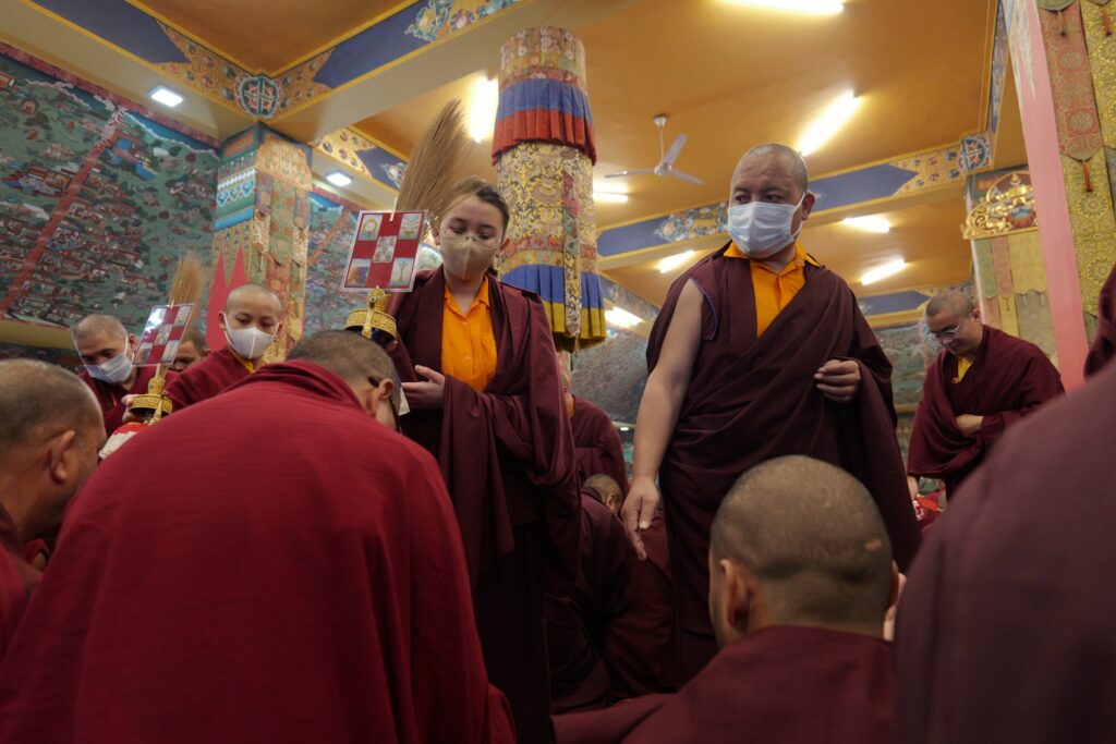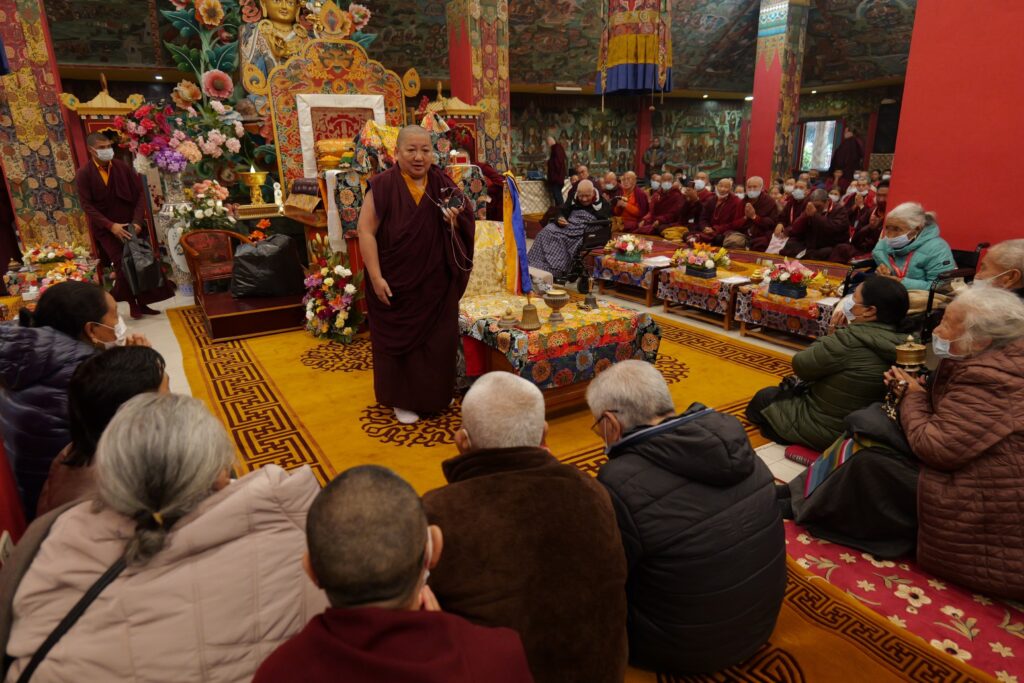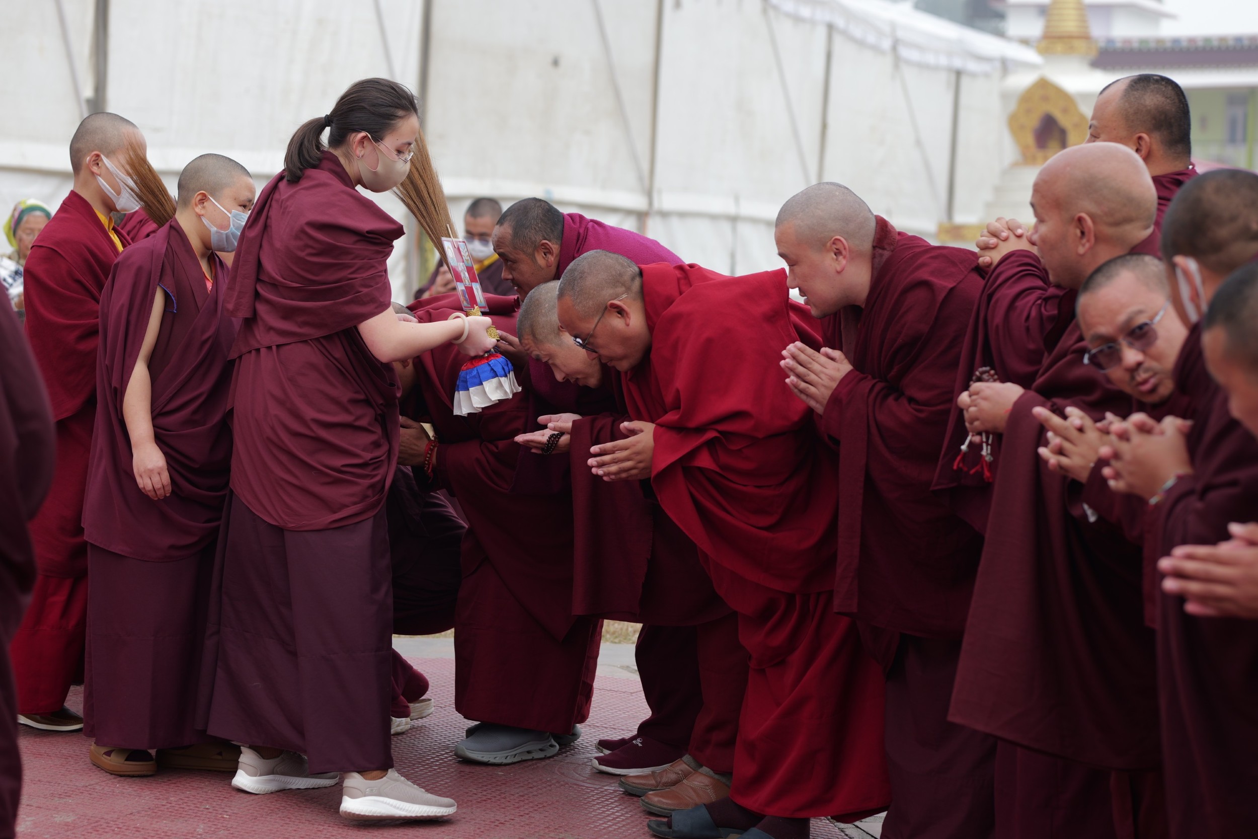 In the morning heartfelt gratitude was expressed to all those who made the transmissions possible, acknowledging the contribution of every individual – from the principal Mindrolling Administrators and Kama Organizers, to the teams of monks, nuns, and Western sangha, as well as all the staff members working hard in the kitchen, security, housekeeping, gardening, together with electricians, plumbers and carpenters. Special appreciation was also extended to the audio-visual team, whose dedicated efforts enabled the connection of spaces within the monastery and made several sessions accessible online to the worldwide sangha.