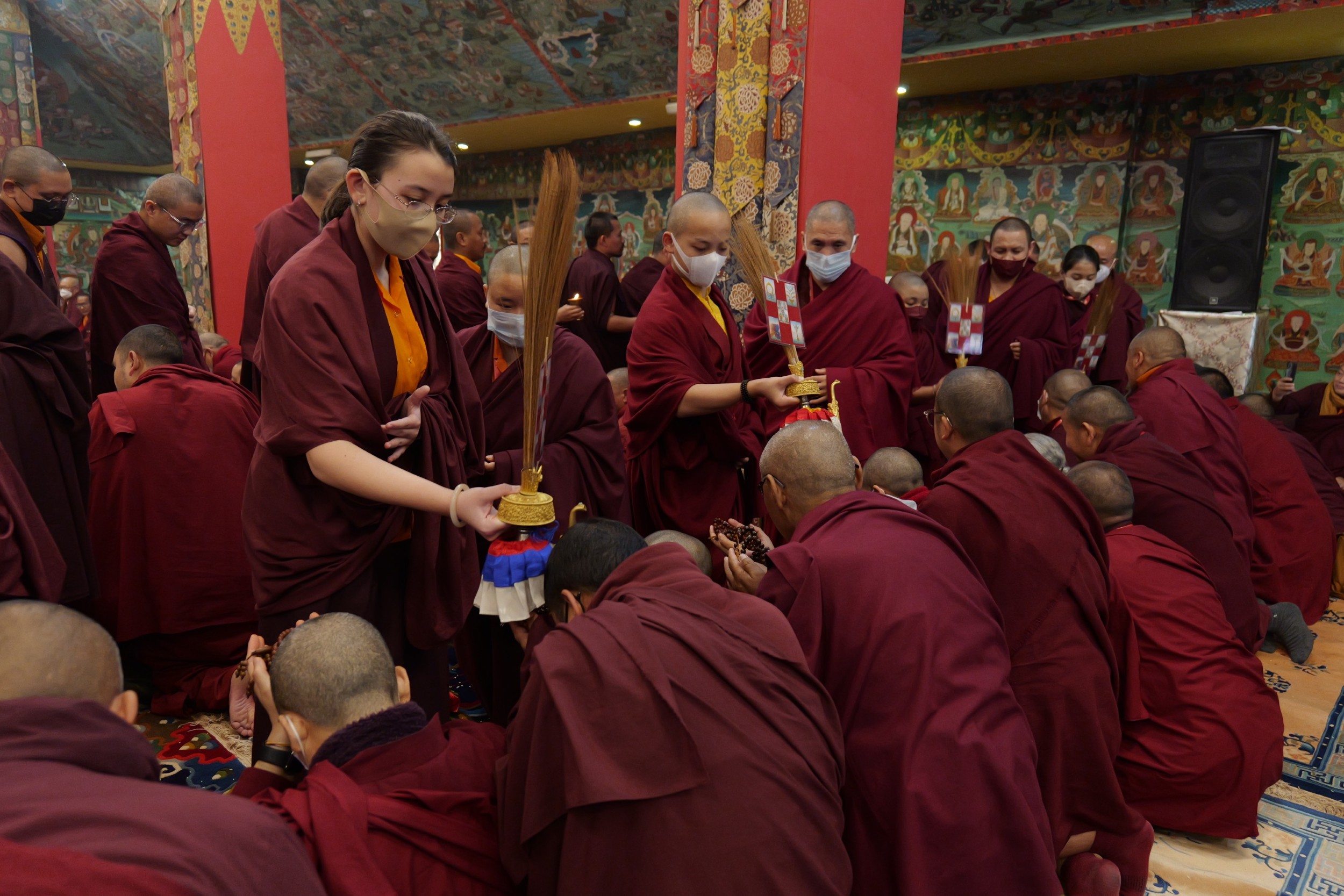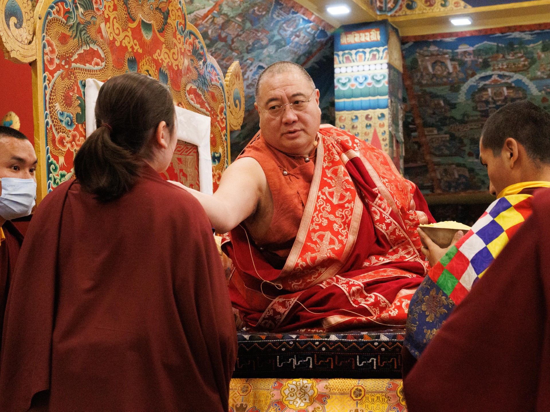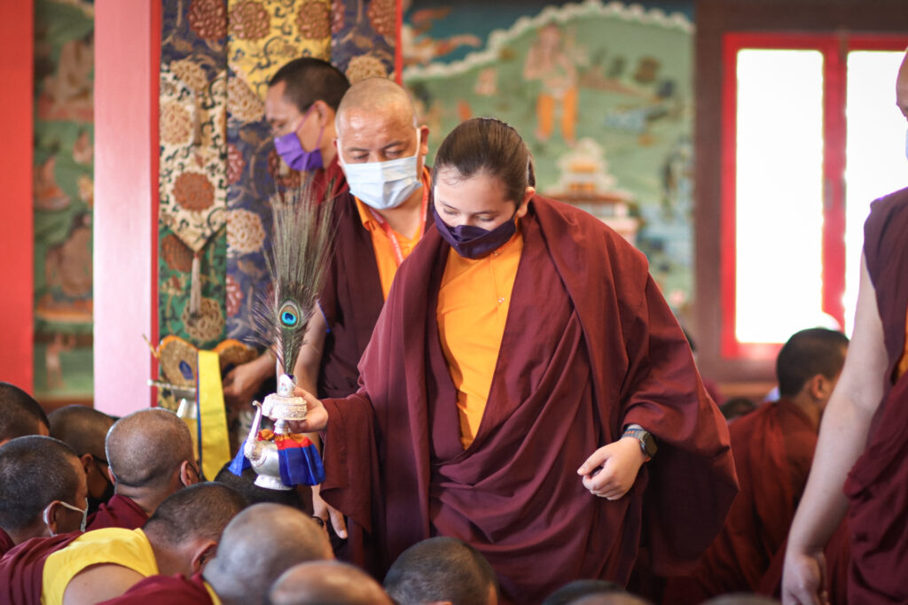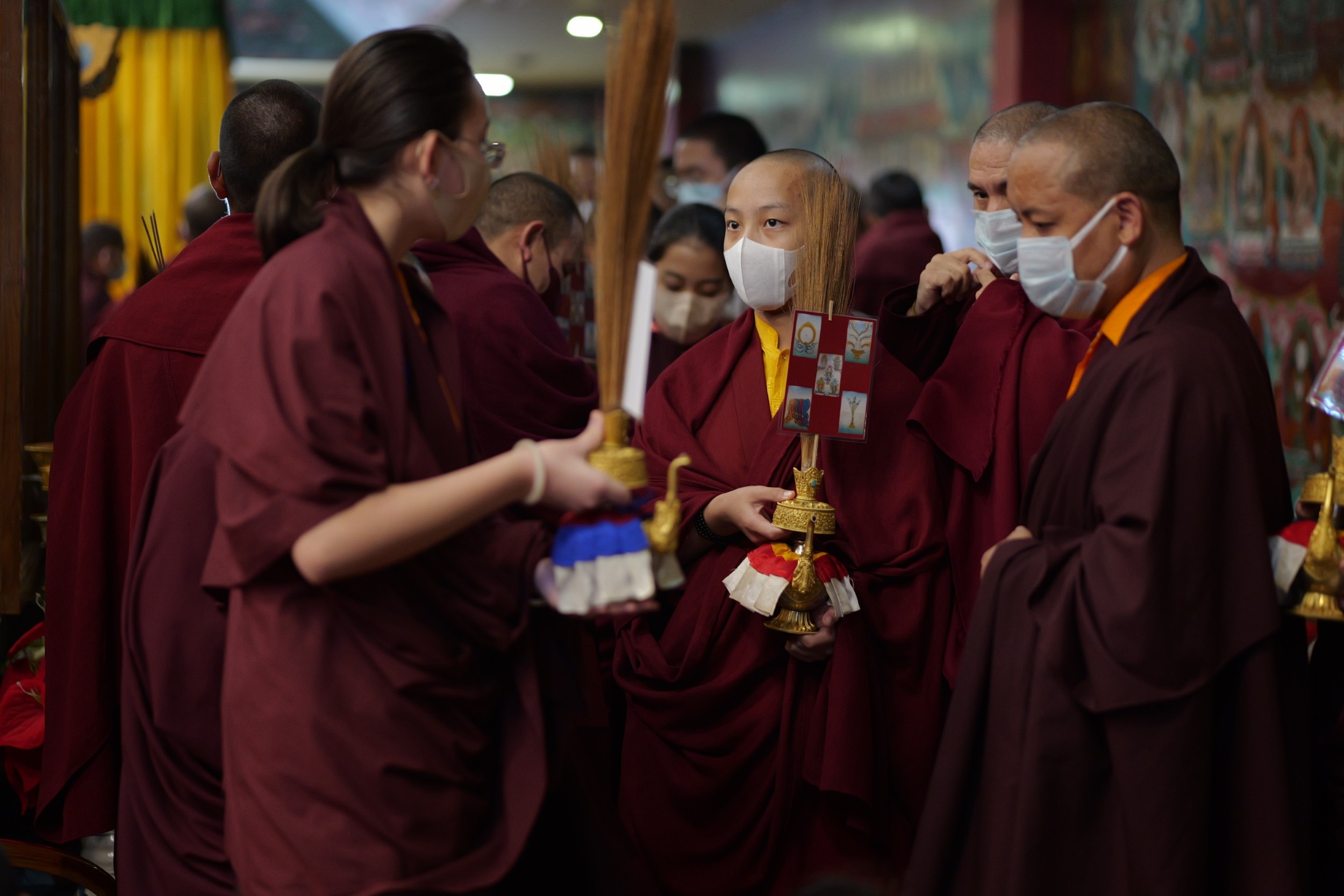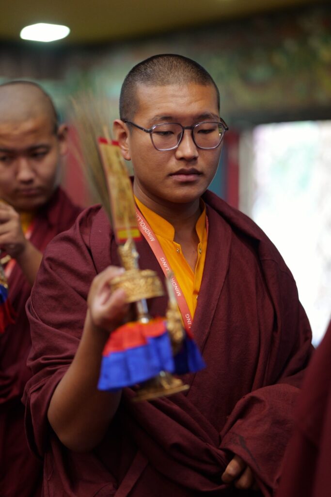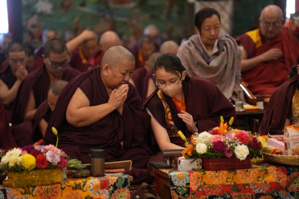 In the morning heartfelt gratitude was expressed to all those who made the transmissions possible, acknowledging the contribution of every individual – from the principal Mindrolling Administrators and Kama Organizers, to the teams of monks, nuns, and Western sangha, as well as all the staff members working hard in the kitchen, security, housekeeping, gardening, together with electricians, plumbers and carpenters. Special appreciation was also extended to the audio-visual team, whose dedicated efforts enabled the connection of spaces within the monastery and made several sessions accessible online to the worldwide sangha.