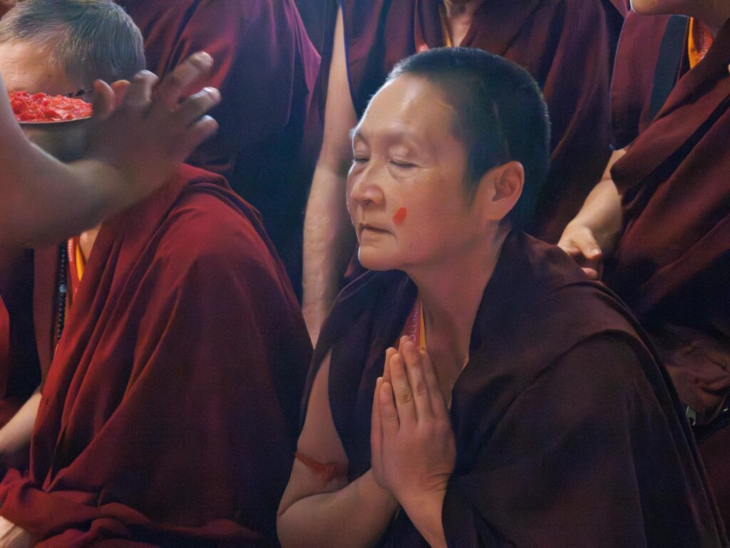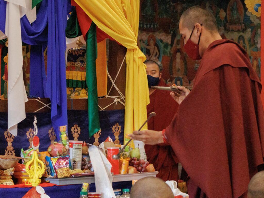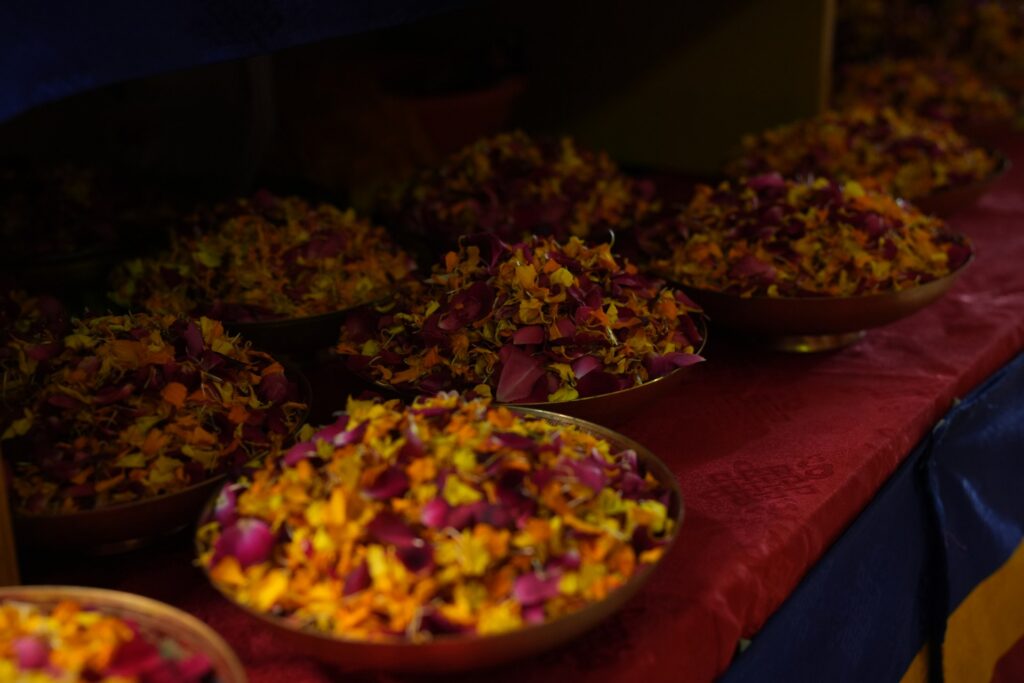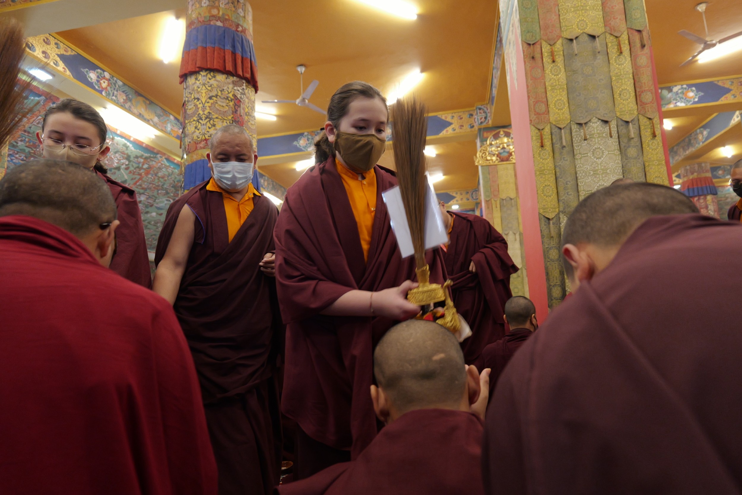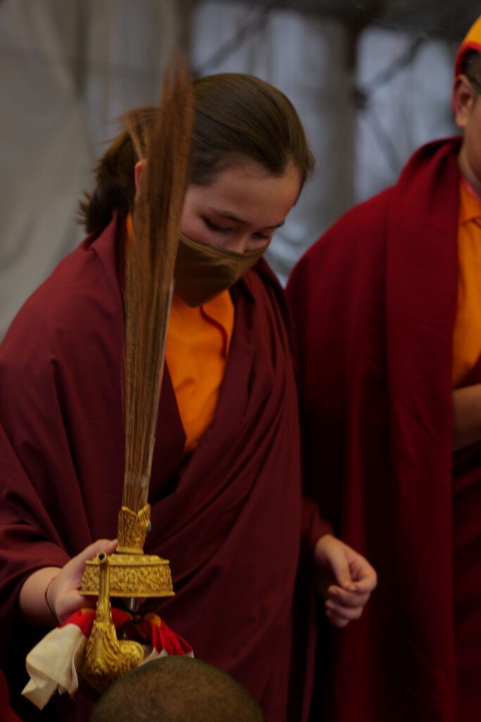 At the end of each day, the team of jedrang monks, Samten Tse nuns, and volunteers from the Mindrolling International sangha, thoroughly cleaned the space of the stupa shrine room and transmission tent, replenishing flower offerings and ensuring an uplifted, respectful, and beautiful environment.