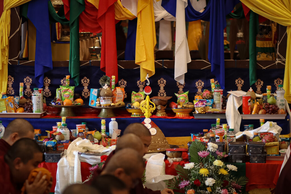 The Kama comprises a vast collection of texts and practices. Therefore, every day the shrine, with its various tormas and elaborate offerings, had to be dismantled and carefully prepared anew for the following day. From early morning until late evening, the chöpön and torma teams worked tirelessly to ensure that the shrine and manifold empowerment articles provided the proper support in accordance with the pure and authentic lineage.