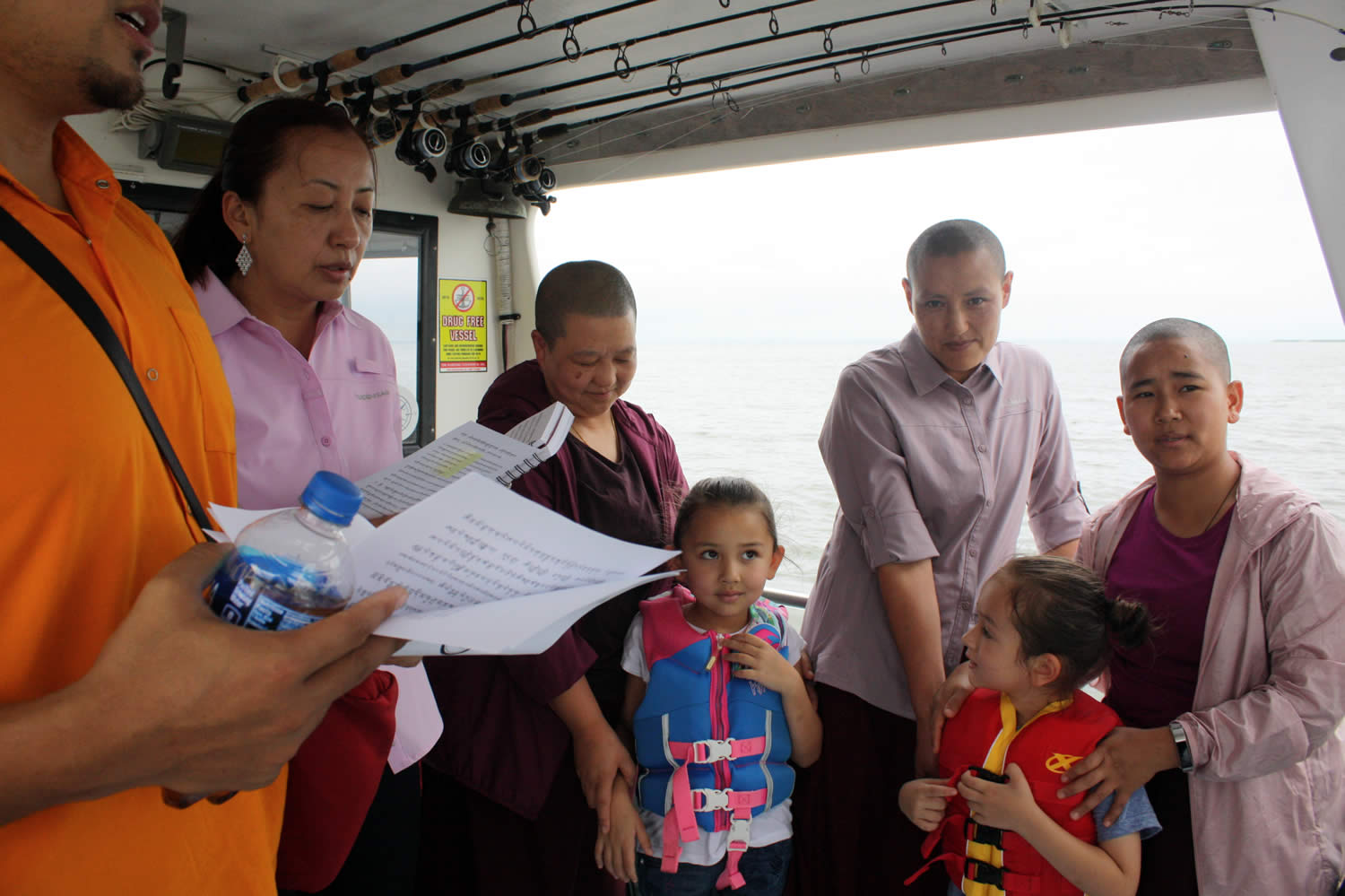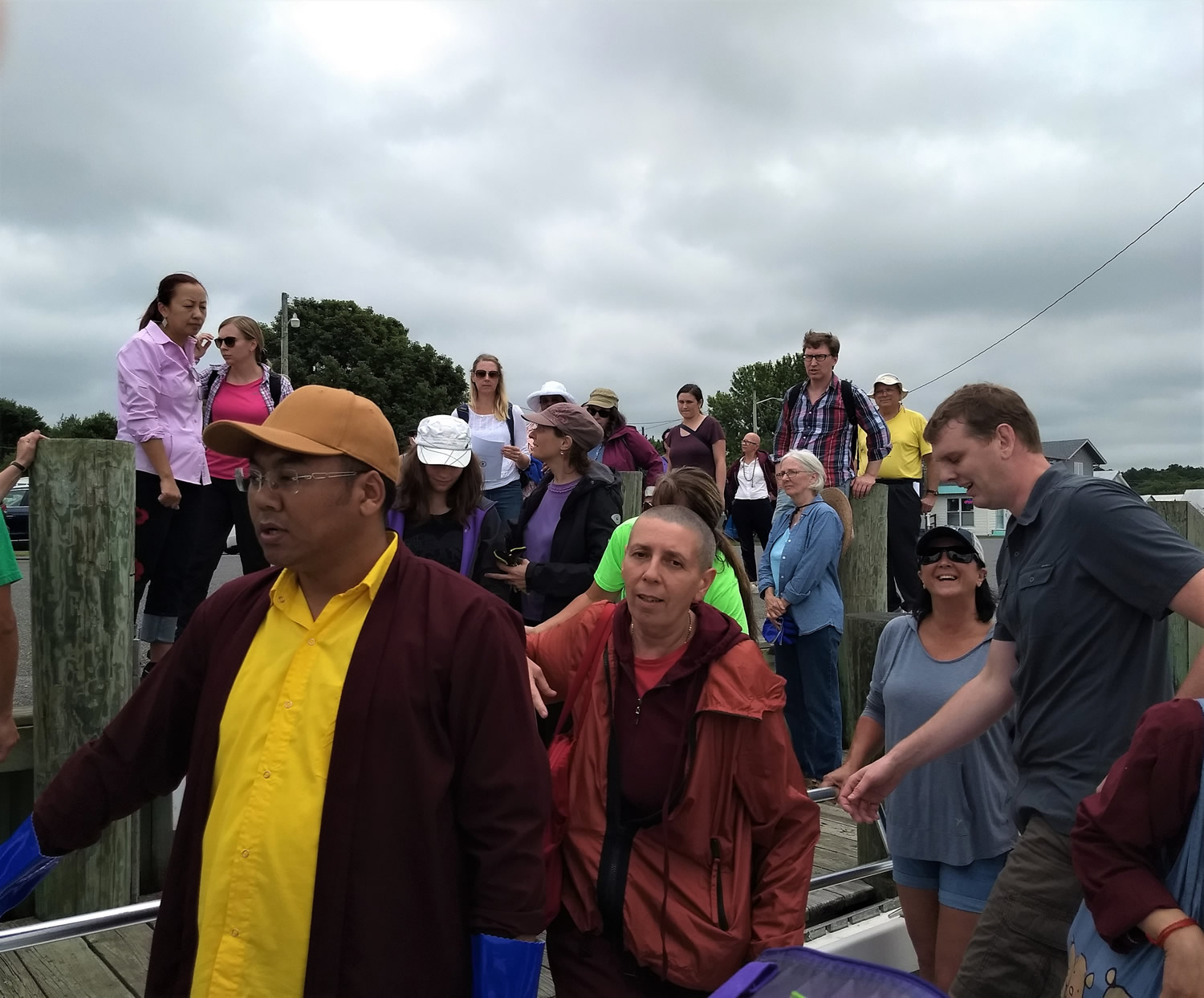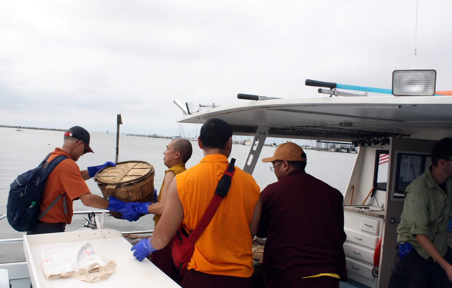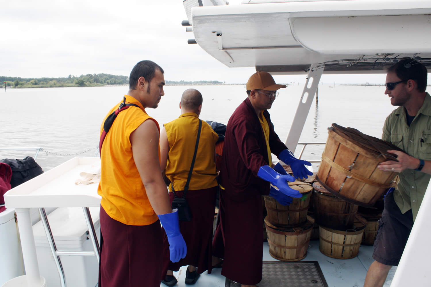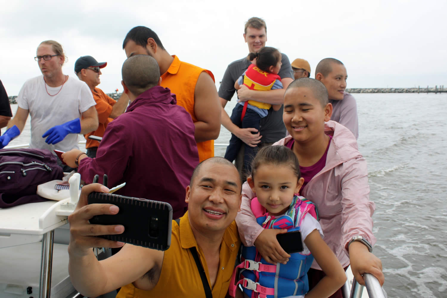 Many thousands of crabs were released by Her Eminence Jetsün Dechen Paldrön, Dungse Rinpoche, Jetsün Rinpoche, Ven. Choktrul Ngawang Jigdral Rinpoche, Ven. Khenpo Namdrol Gyatso, Ven. Lopön Thrinley Gyaltsen and Kunda Britton Bosarge la who were joined by staff and sangha members. Prayers for Life Release and the Long-Life Supplication to Jetsün Khandro Rinpoche were recited on board the boat, led by Ven. Choktrul Ngawang Jigdral Rinpoche, chief Umdze of Mindrolling Monastery. Each bushel of crabs was blessed and marked with symbols to protect them from being recaptured. The tsethar ceremony concluded in a nearby park where everyone gathered to recite aspirations.