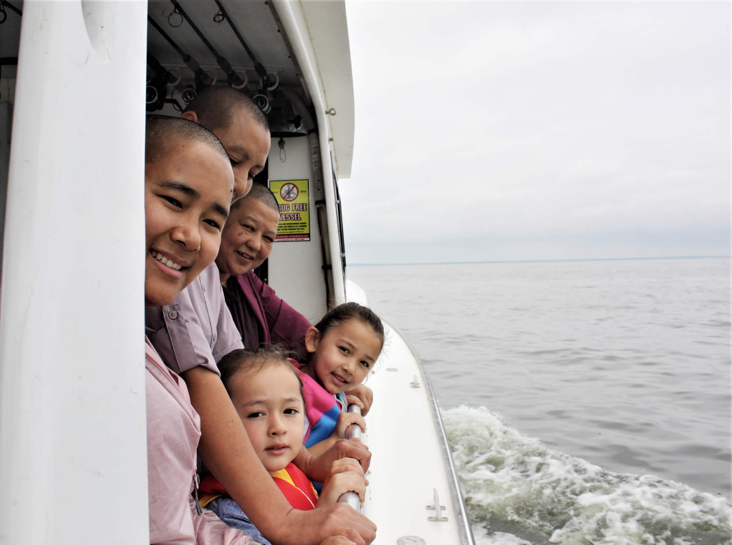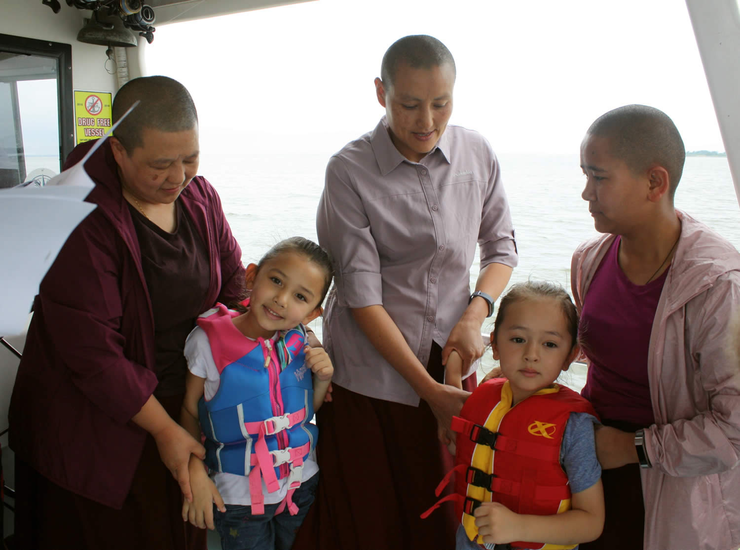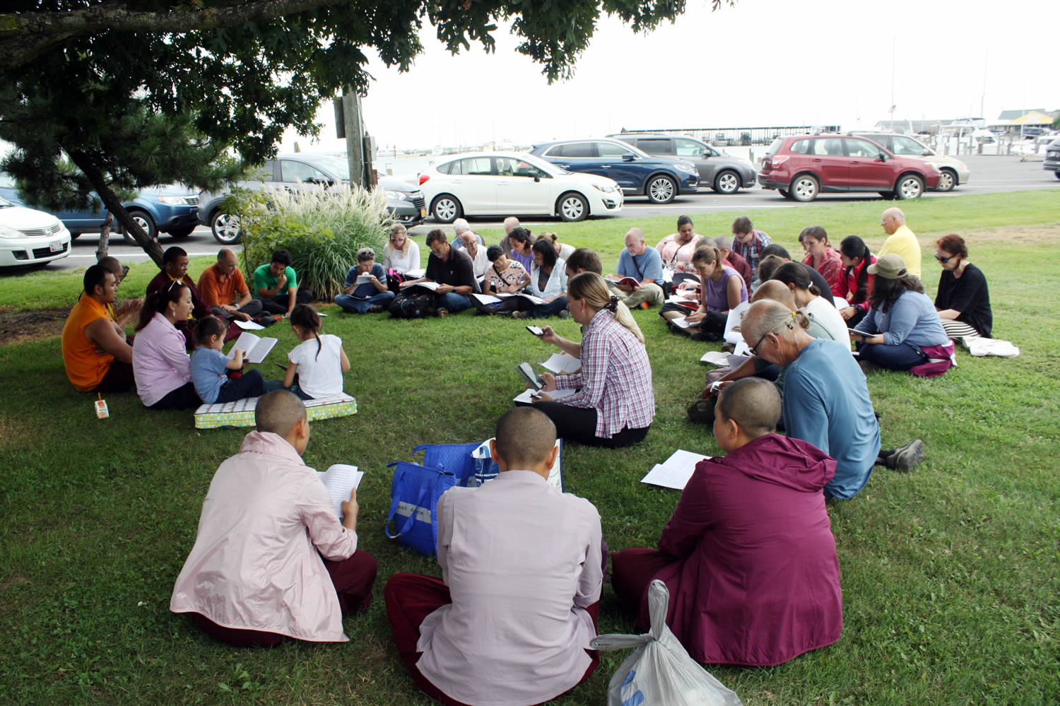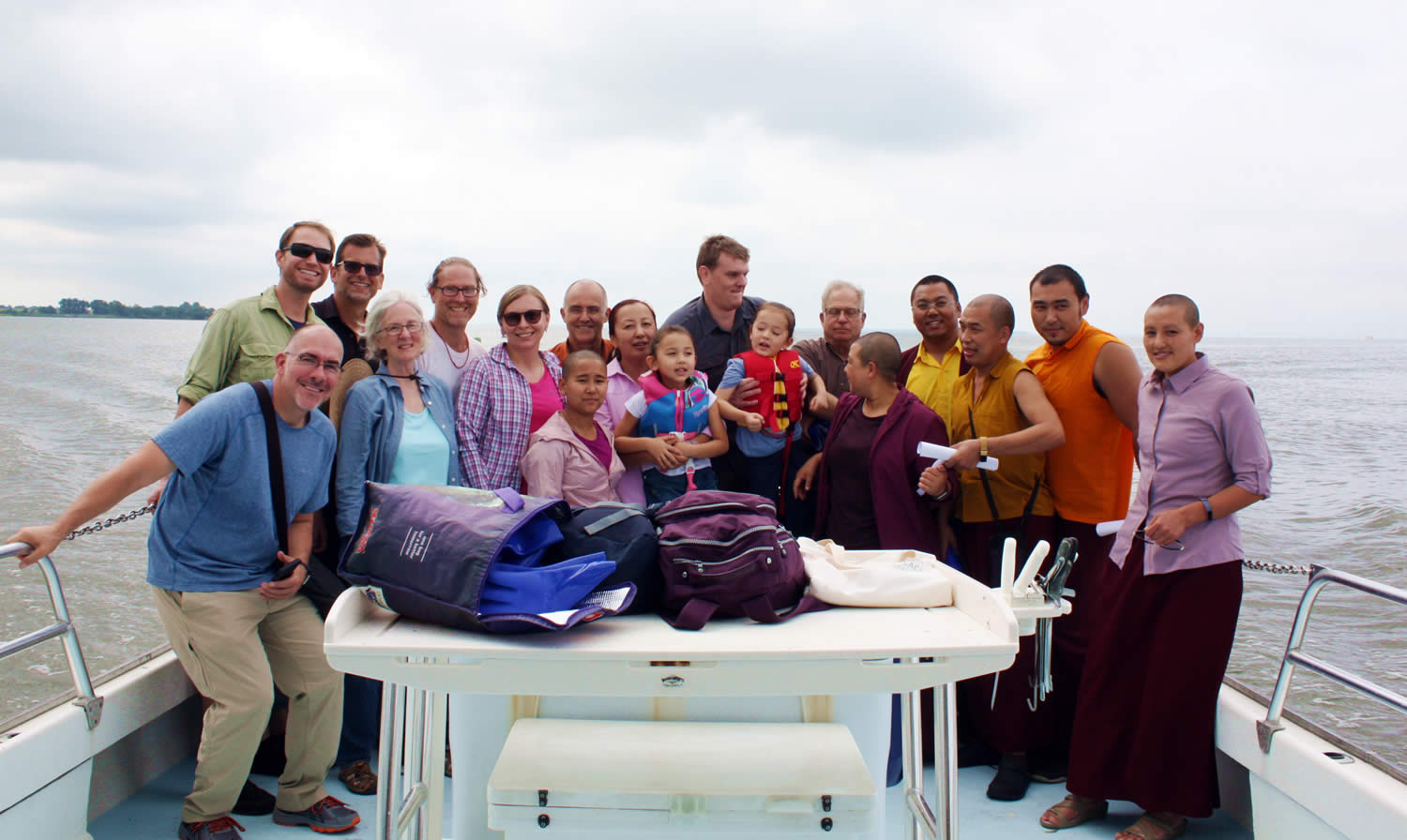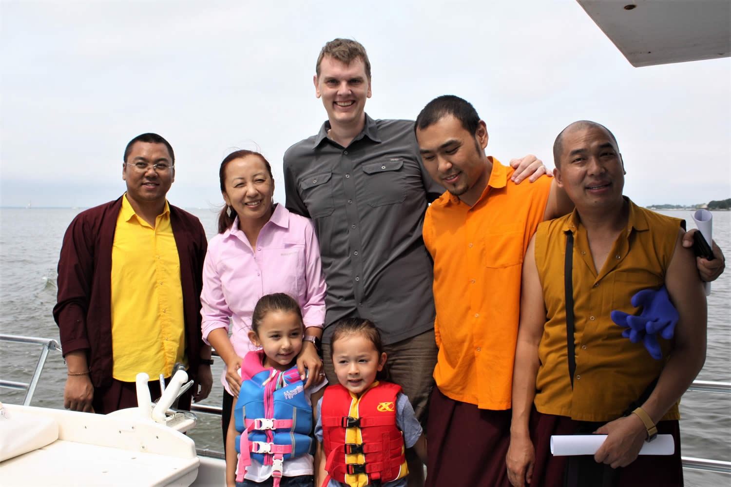 Many thousands of crabs were released by Her Eminence Jetsün Dechen Paldrön, Dungse Rinpoche, Jetsün Rinpoche, Ven. Choktrul Ngawang Jigdral Rinpoche, Ven. Khenpo Namdrol Gyatso, Ven. Lopön Thrinley Gyaltsen and Kunda Britton Bosarge la who were joined by staff and sangha members. Prayers for Life Release and the Long-Life Supplication to Jetsün Khandro Rinpoche were recited on board the boat, led by Ven. Choktrul Ngawang Jigdral Rinpoche, chief Umdze of Mindrolling Monastery. Each bushel of crabs was blessed and marked with symbols to protect them from being recaptured. The tsethar ceremony concluded in a nearby park where everyone gathered to recite aspirations.
