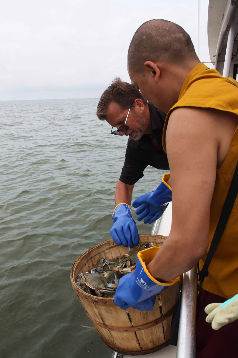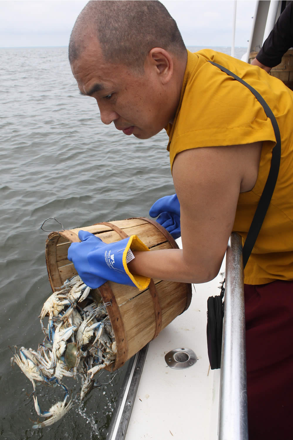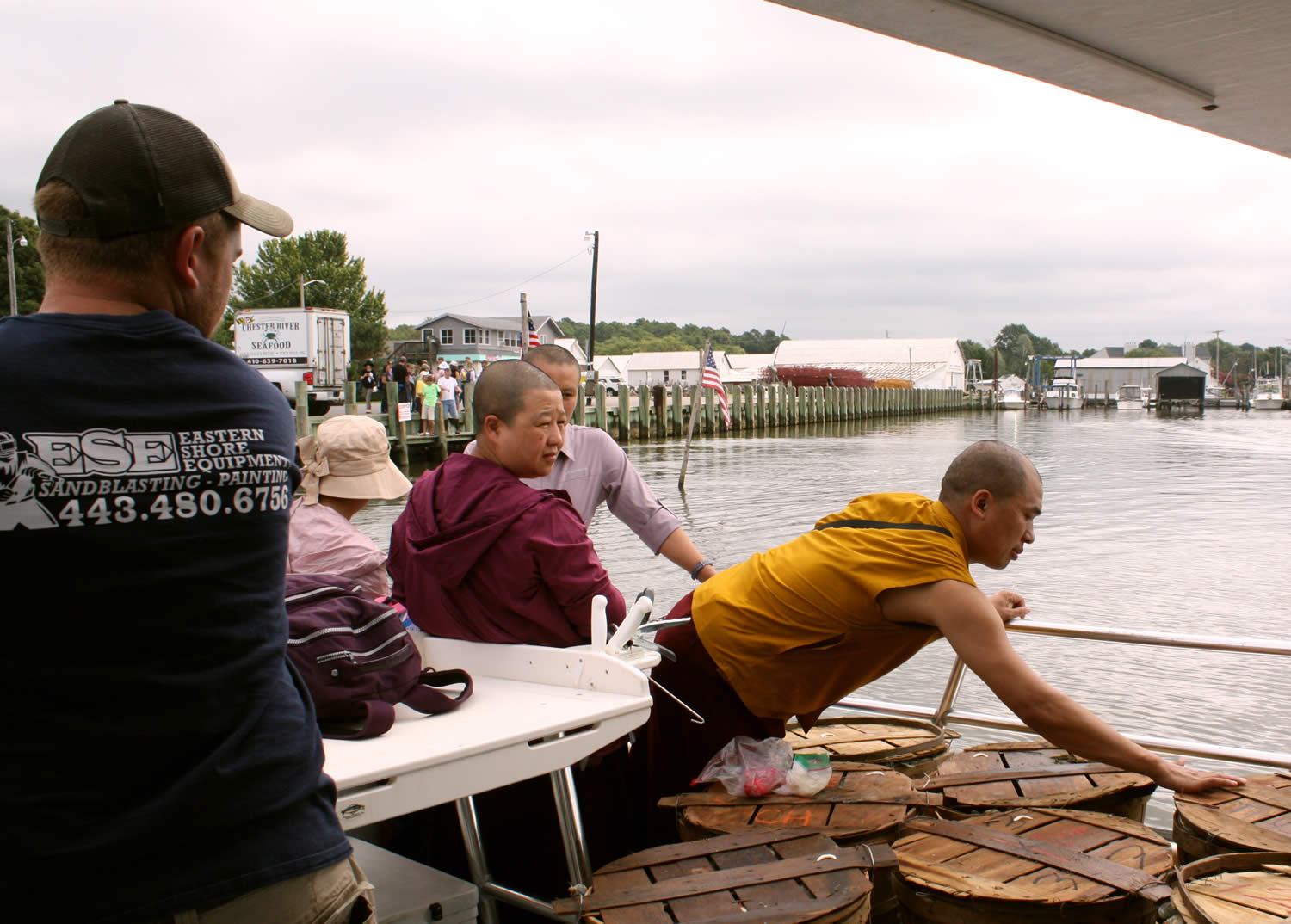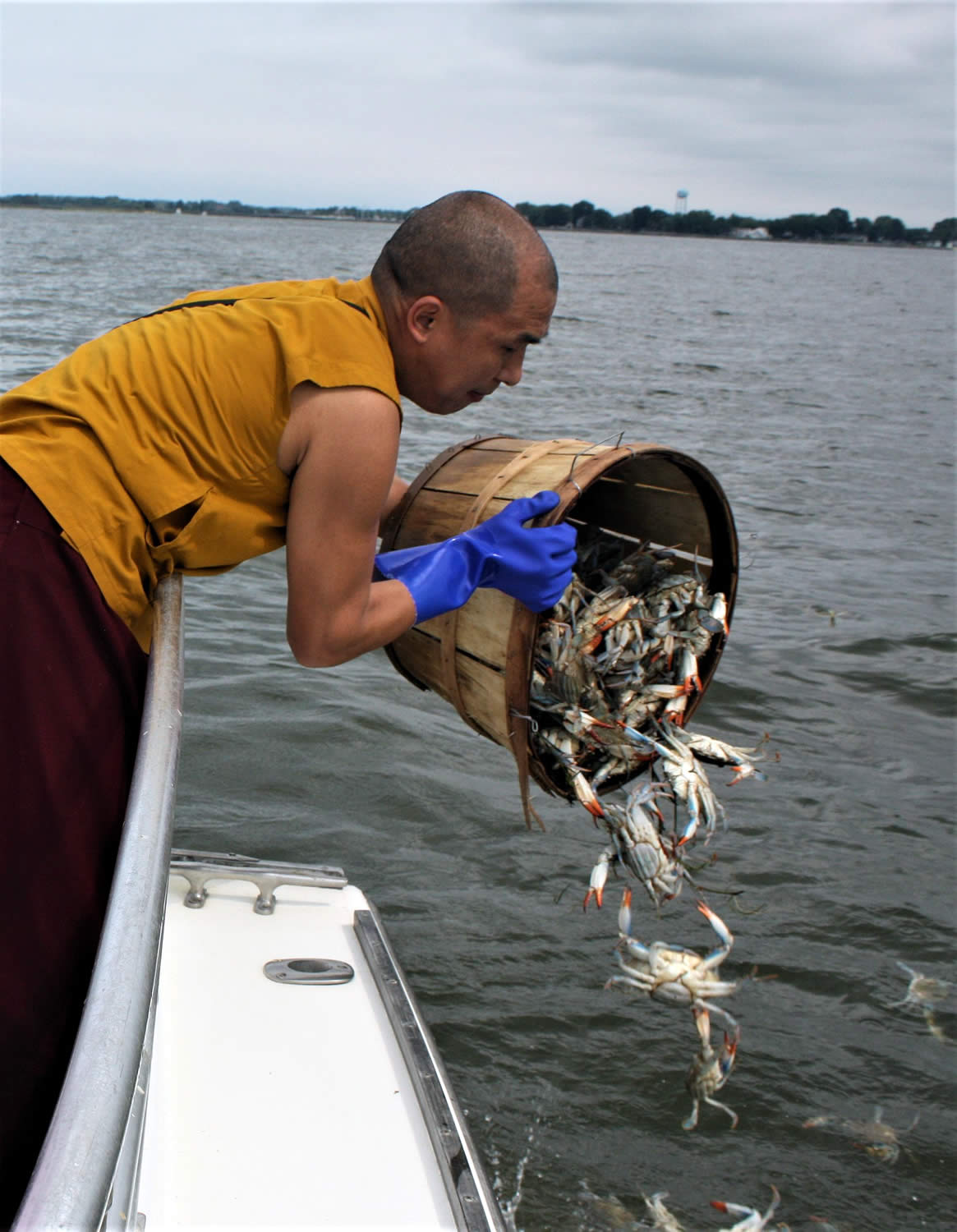 Sangha members wholeheartedly offered donations for the purchase more than 100 bushels of beautiful blue crabs from a local crab fishing business and to rent the boat which would carry the crabs to freedom. Each bushel contained over a hundred crabs which had been previously caught and refrigerated, and were now headed back to the waters from which they had come.