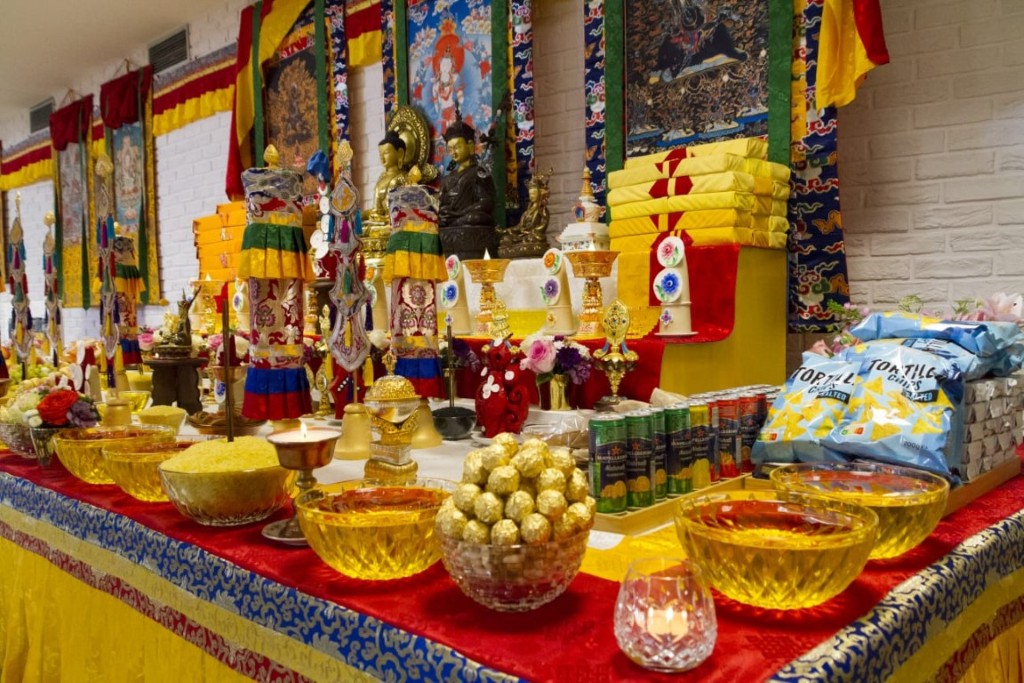 At the conclusion of the retreat, Rinpoche led the gathered sangha in the tshog offering to Guru Rinpoche, and the worldwide sangha also joined by live stream from their own homes in performing the ganachakra offering. With an array of vast offerings in shrine rooms spanning the world, the sangha practiced as one at the feet of the guru.